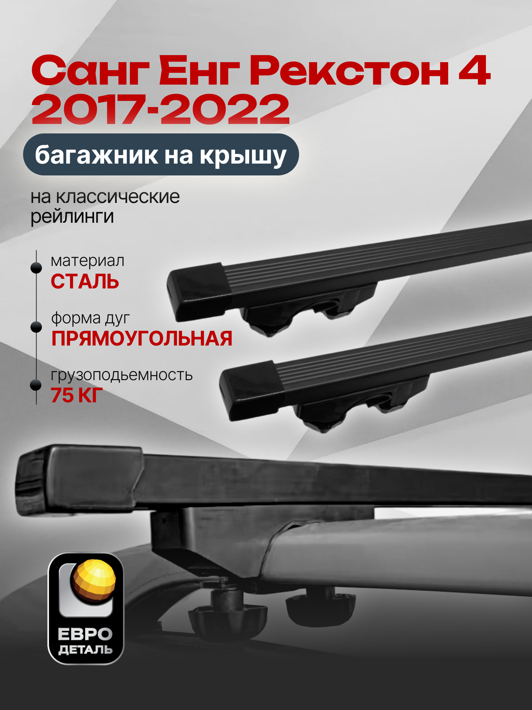 Багажник на крышу ЕвроДеталь Start предназначен для установки на Санг Енг Рекстон 4 2017-2022, черный с классическими рейлингами.