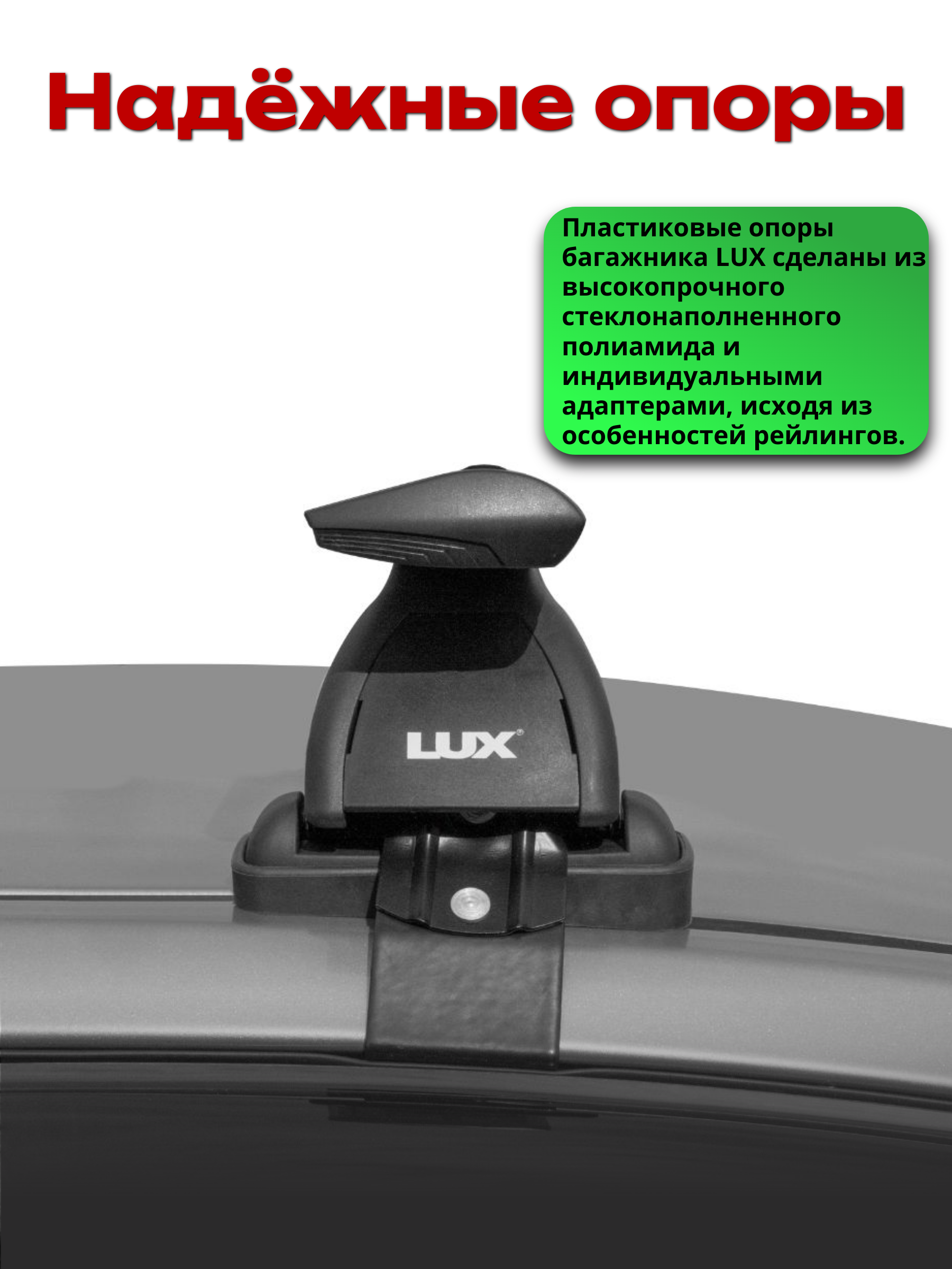 Конструкция багажника LUX состоит из двух поперечных дуг крыловидной формы, монтирующиеся на крышу автомобиля на специальных опорах.