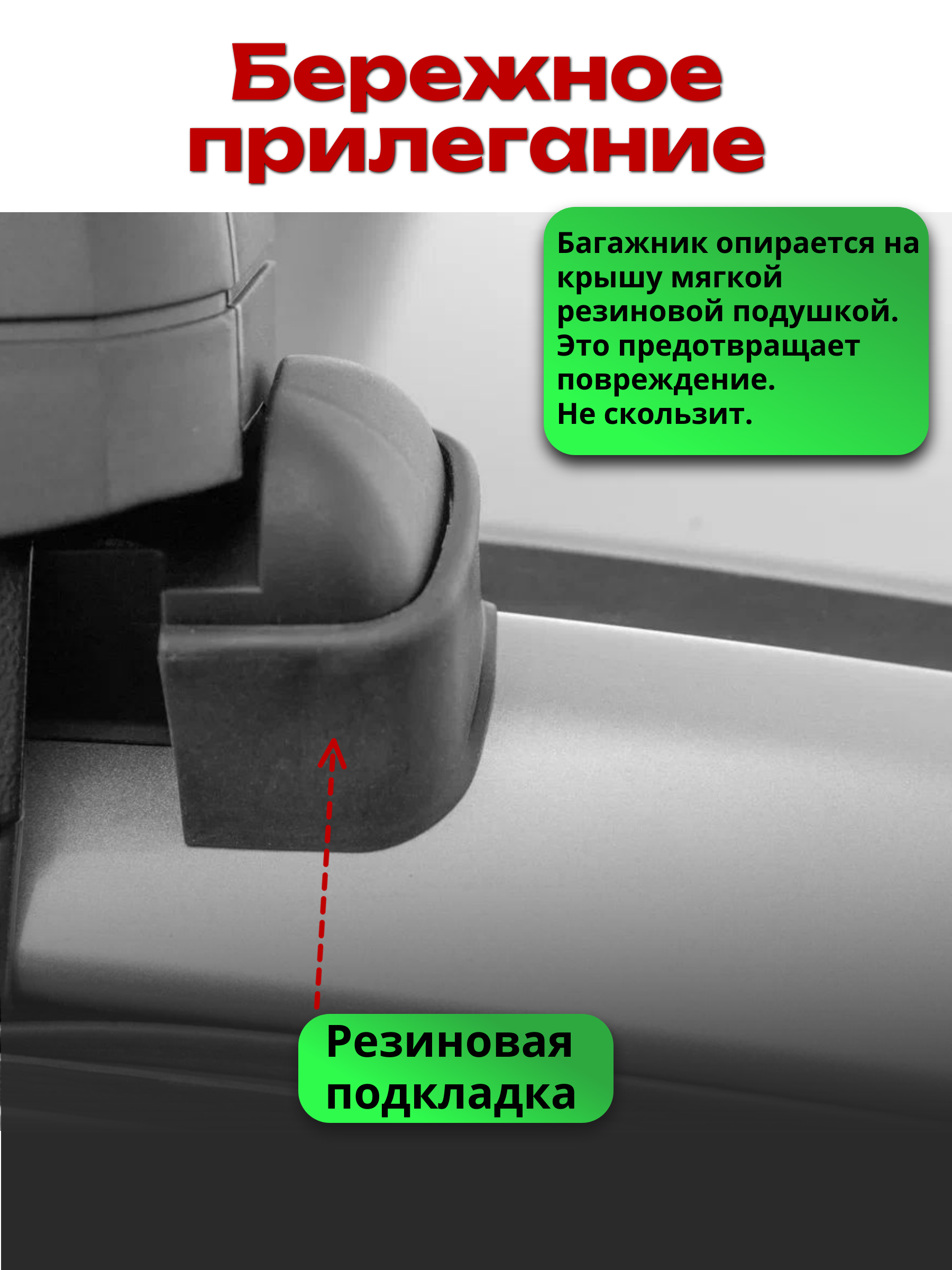 Поперечные перекладины изготовлены из прочного алюминиевого сплава, внутри профиль дуг имеет перемычки для жестки. Опоры прижимаются к крыше через резиновые подкладки, предохраняющие поверхность от механических повреждений при использовании багажника и обеспечивающие идеальное прилегание.