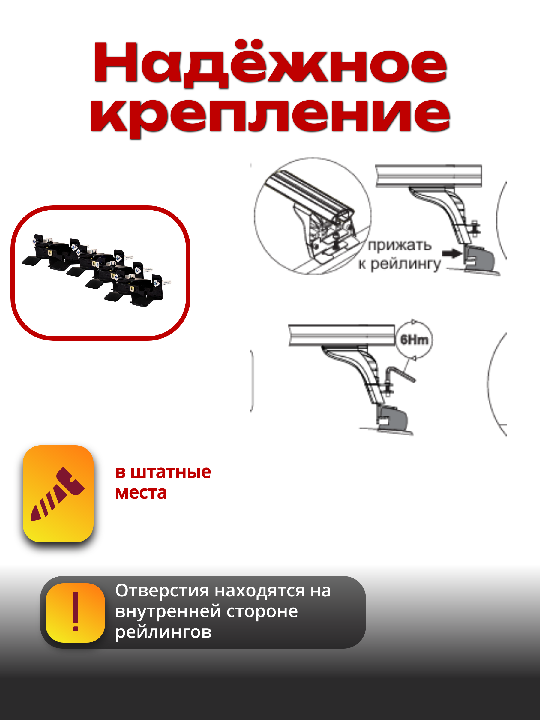 Поперечные перекладины изготовлены из прочного алюминиевого сплава, внутри профиль дуг имеет перемычки для жестки. Опоры прижимаются к крыше через резиновые подкладки, предохраняющие поверхность от механических повреждений при использовании багажника и обеспечивающие идеальное прилегание.