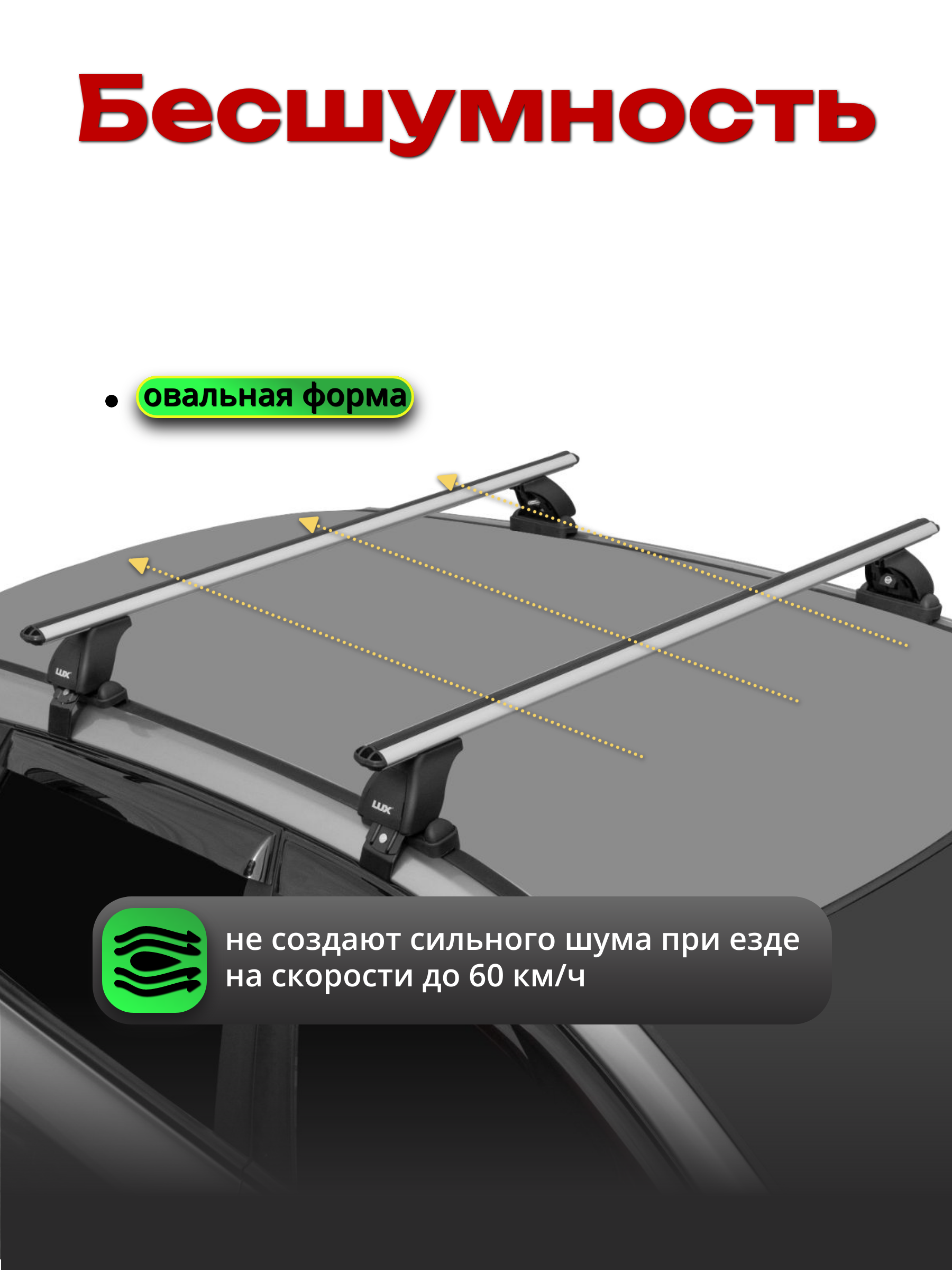 Багажник LUX дуги аэро-классик имеет поперечные дуги аэродинамической формы шириной 53 мм, что значительно снижает уровень шума при движении автомобиля.