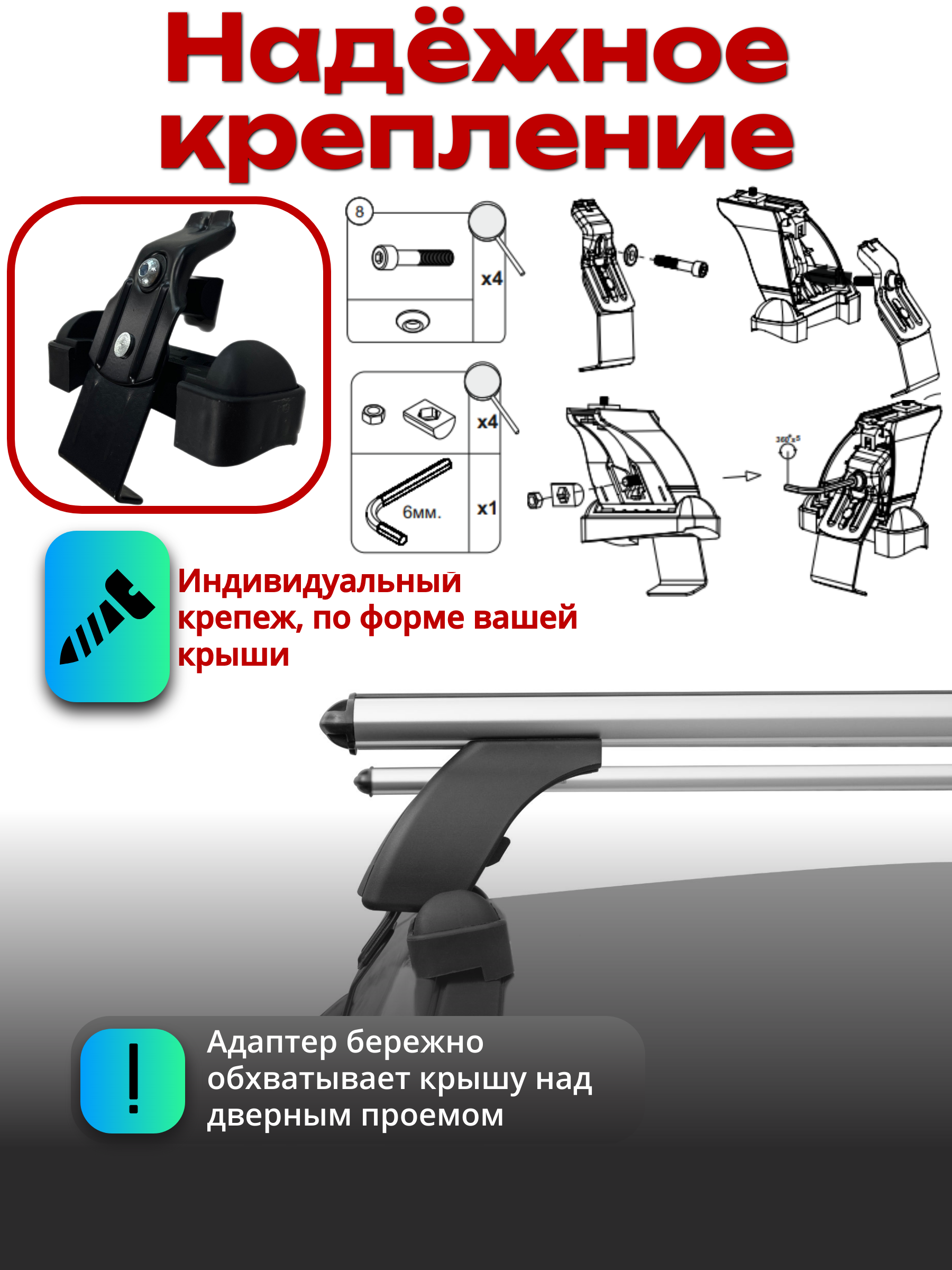 Поперечные перекладины изготовлены из прочного алюминиевого сплава, внутри профиль дуг имеет перемычки для жестки. Опоры прижимаются к крыше через резиновые подкладки, предохраняющие поверхность от механических повреждений при использовании багажника и обеспечивающие идеальное прилегание.