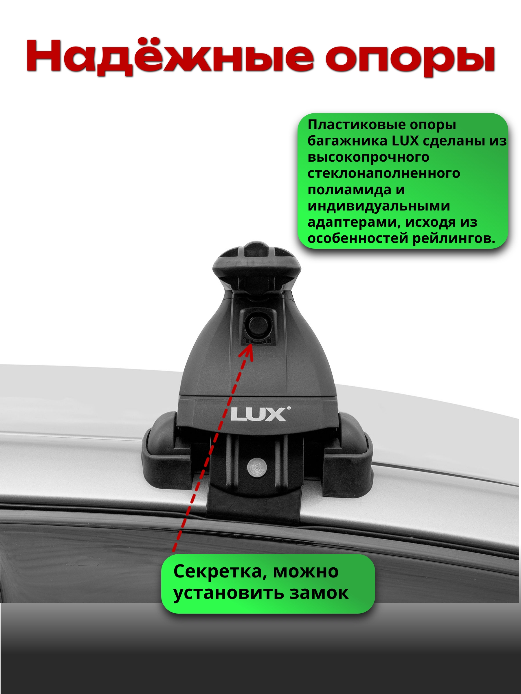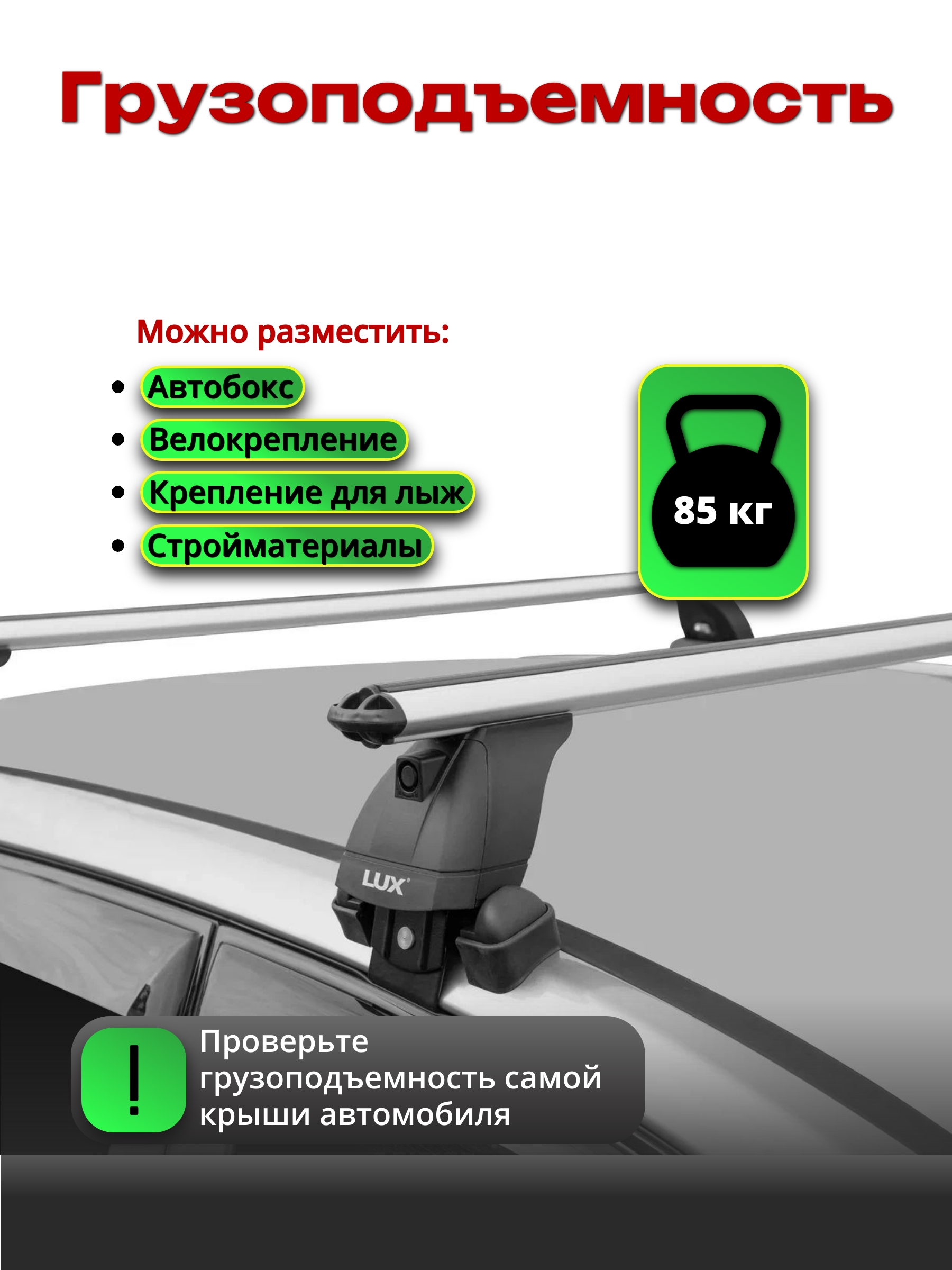 Надежная багажная система LUX (Люкс) хорошо приспособлена для перевозки любых грузов, весом не превышающим разрешенную нагрузку на крышу вашего автомобиля (см. инструкцию к автомобилю) и установки дополнительных автоаксессуаров: автобоксы, крепления для велосипедов и прочие.