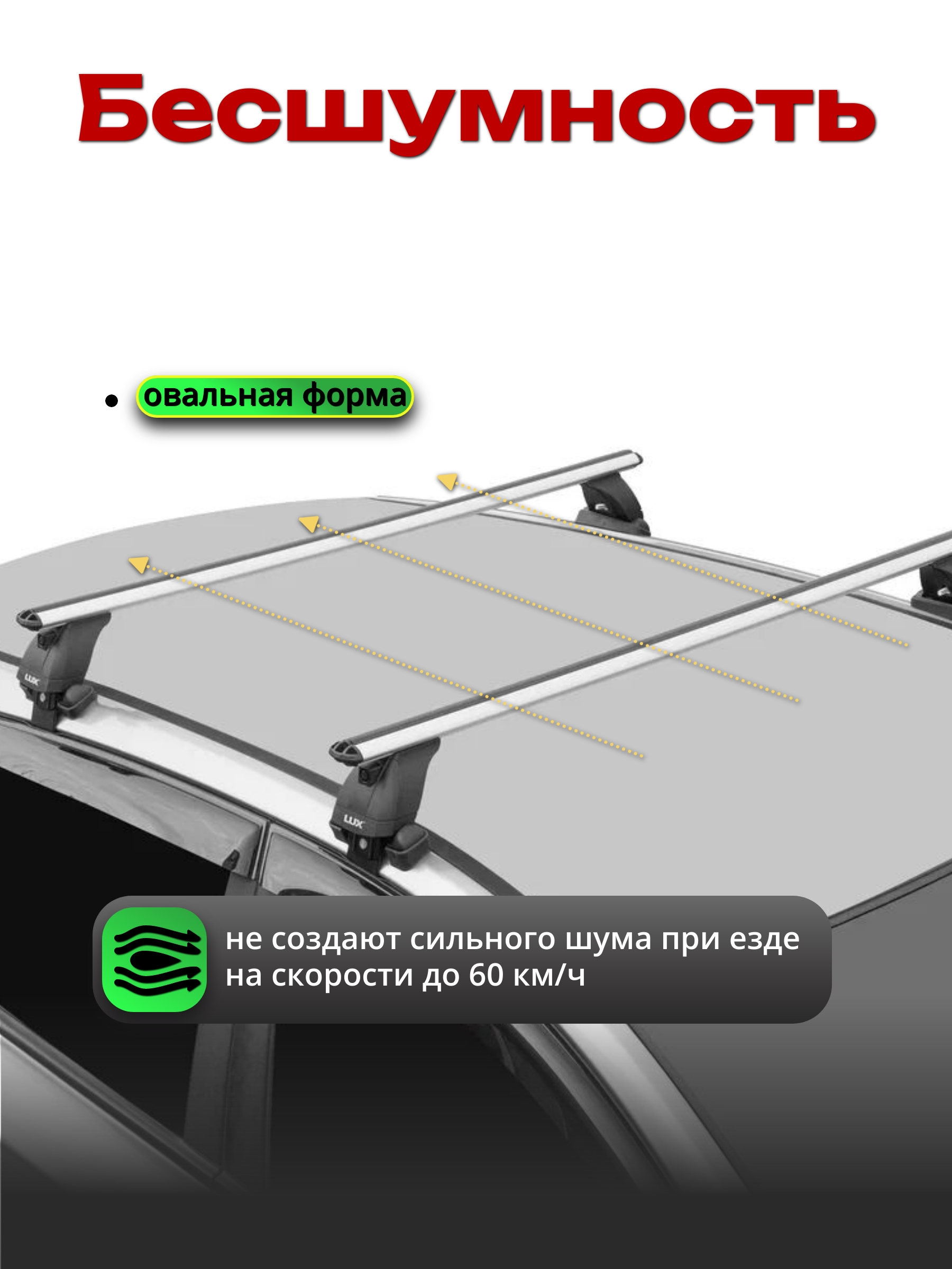 Багажная система LUX БК3 дуги аэро-классик имеет поперечные дуги аэродинамической (овальной) формы шириной 53 мм, что значительно снижает уровень шума при движении автомобиля.