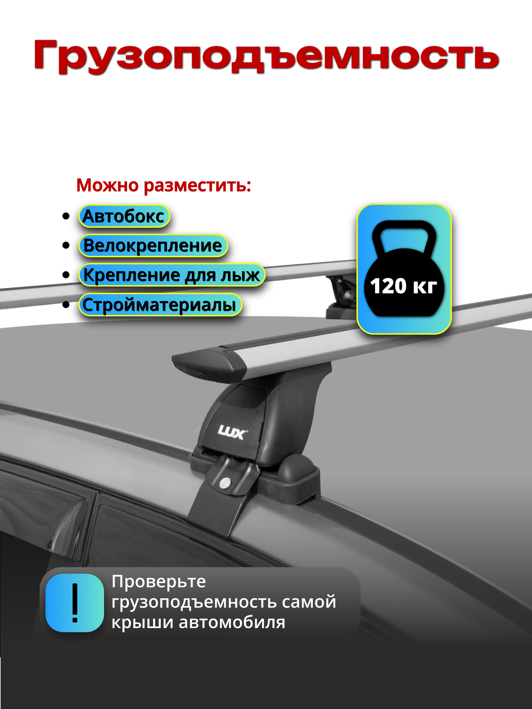 Надежная багажная система LUX (Люкс) хорошо приспособлена для перевозки любых грузов, весом не превышающим разрешенную нагрузку на крышу вашего автомобиля (см. инструкцию к автомобилю) и установки дополнительных автоаксессуаров: автобоксов, креплений для велосипедов и прочих.