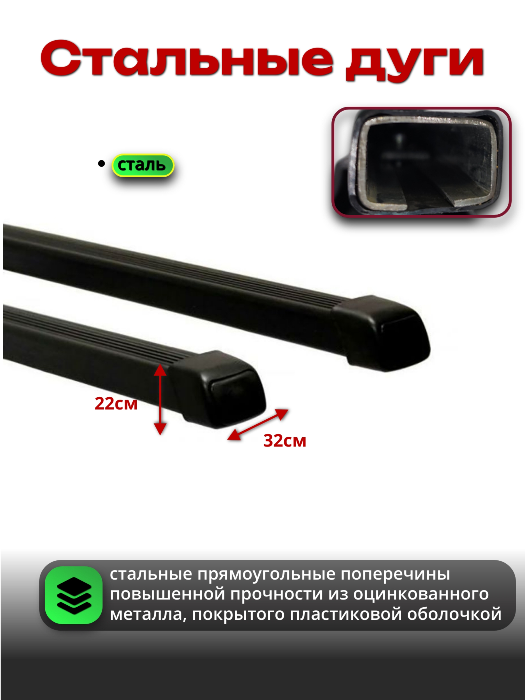Конструкция багажника LUX состоит из двух поперечных дуг прямоугольного сечения, которые монтируются на крыше автомобиля на специальных опорах.