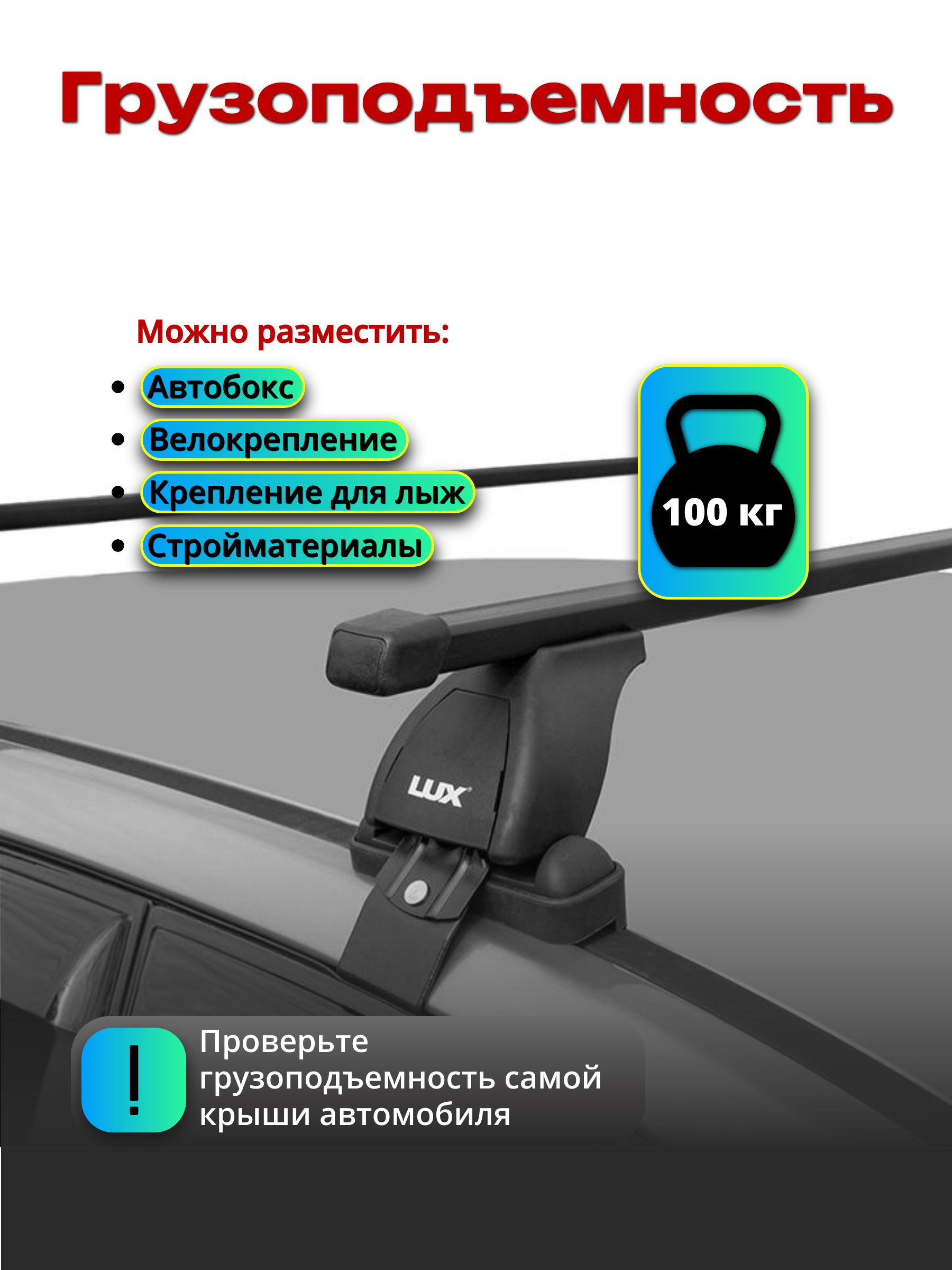 Надежная багажная система LUX (Люкс) хорошо приспособлена для перевозки любых грузов, весом не превышающим разрешенную нагрузку на крышу вашего автомобиля (см. инструкцию к автомобилю) и установки дополнительных автоаксессуаров: автобоксов, креплений для велосипедов и прочих.