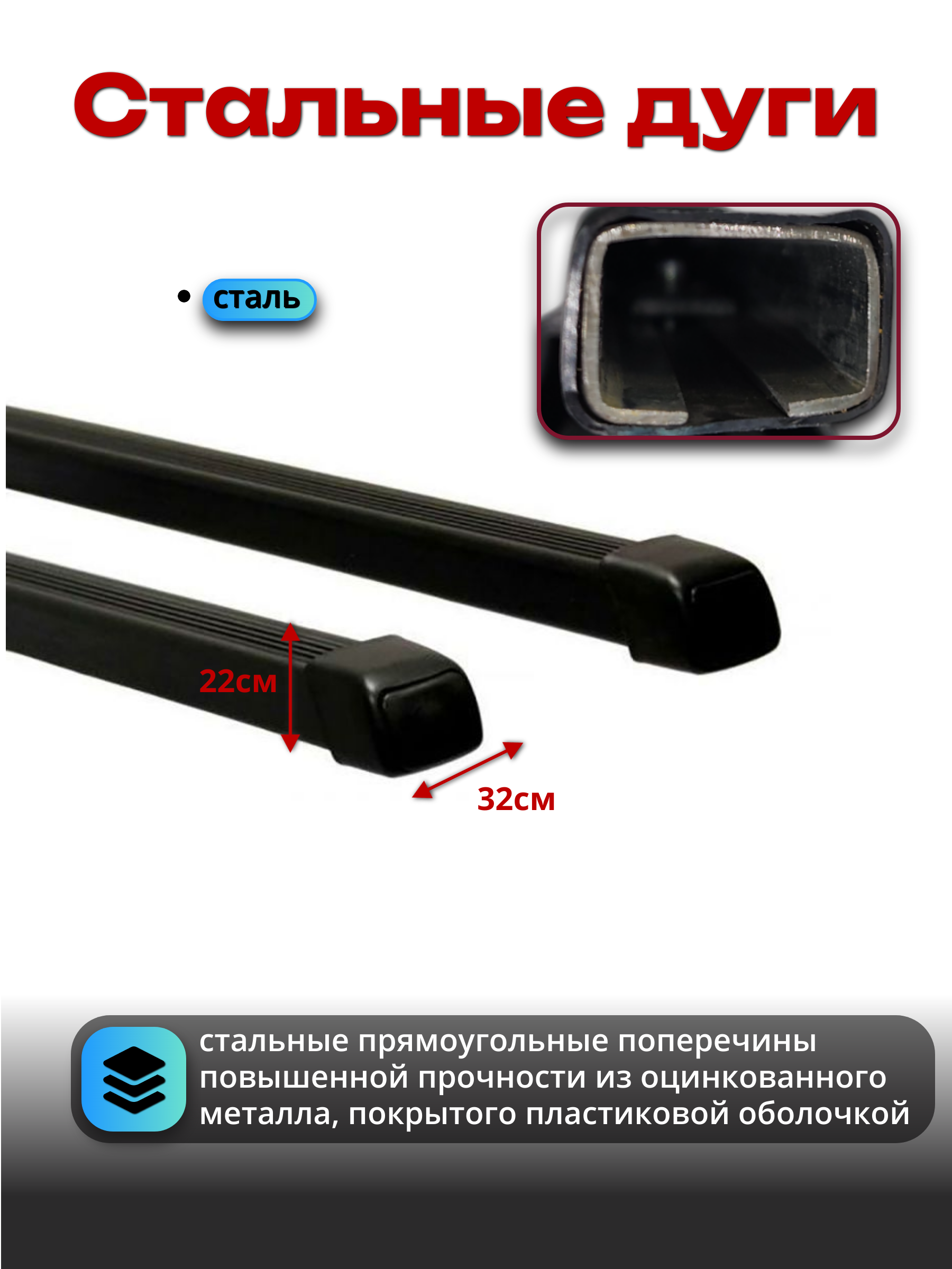 Конструкция багажника LUX состоит из двух поперечных дуг прямоугольного сечения, которые монтируются на крыше автомобиля на специальных опорах.