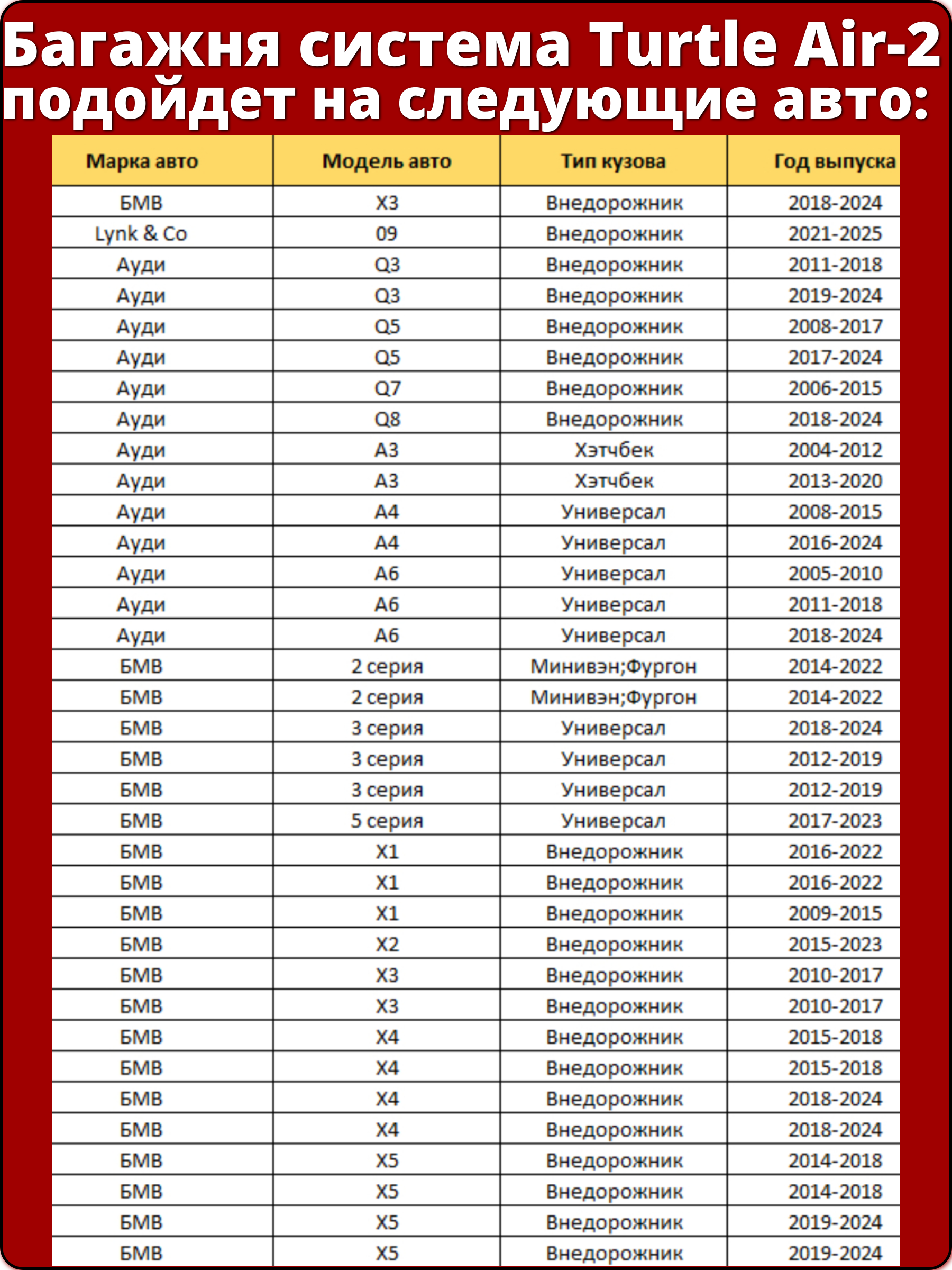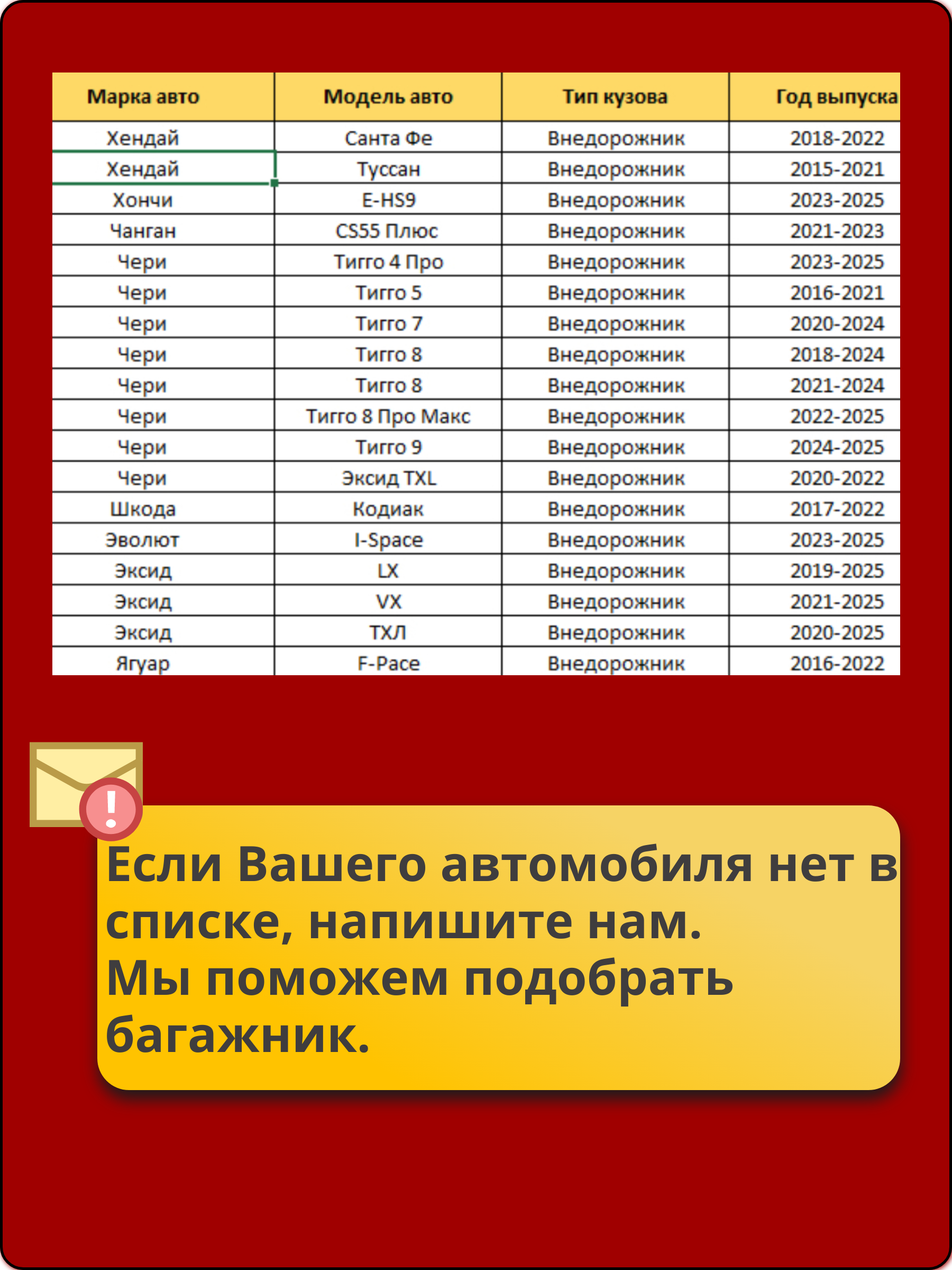 Список автомобилей, на который подойдет данный багажник, Вы можете найти в фотографиях.