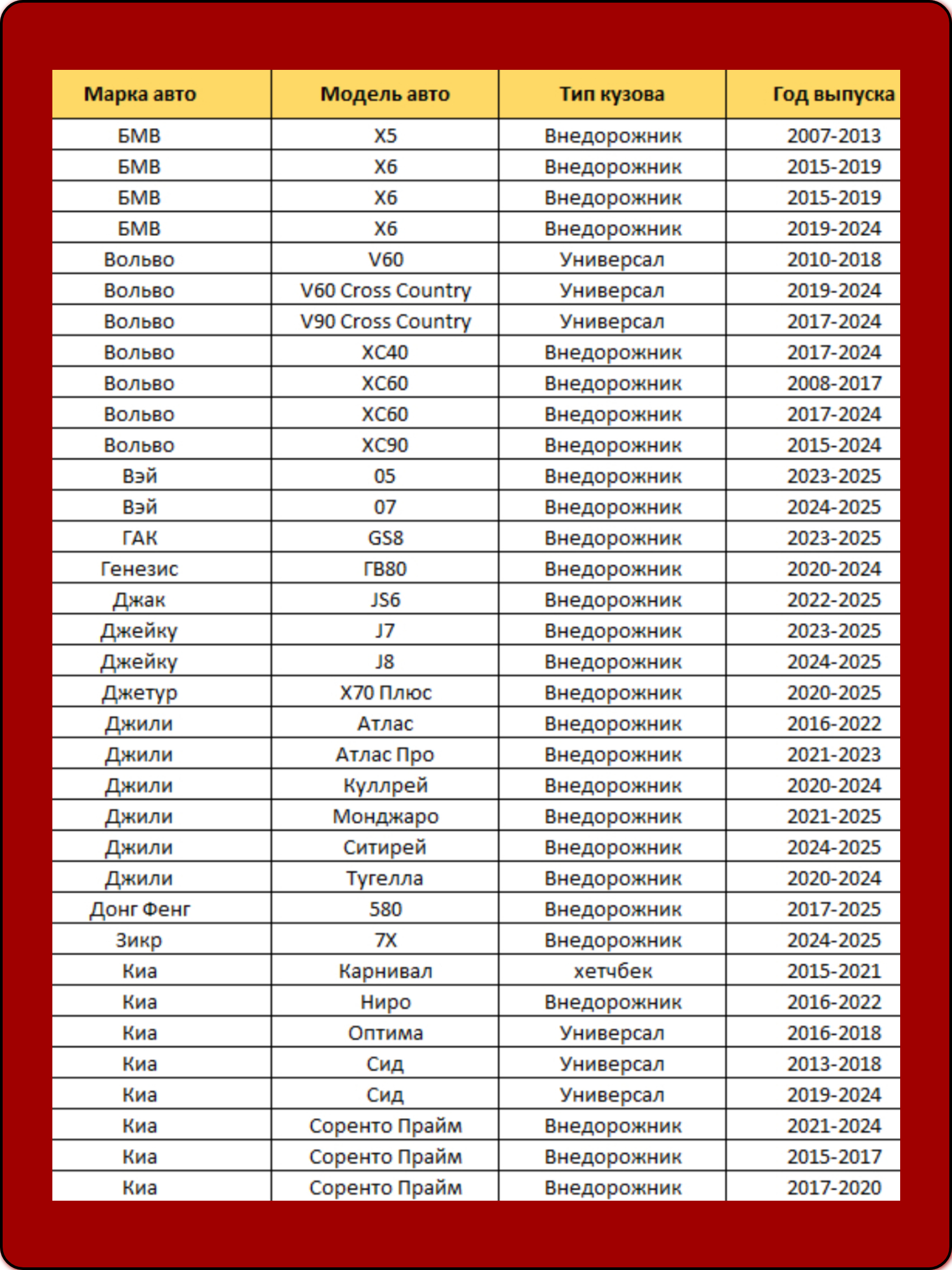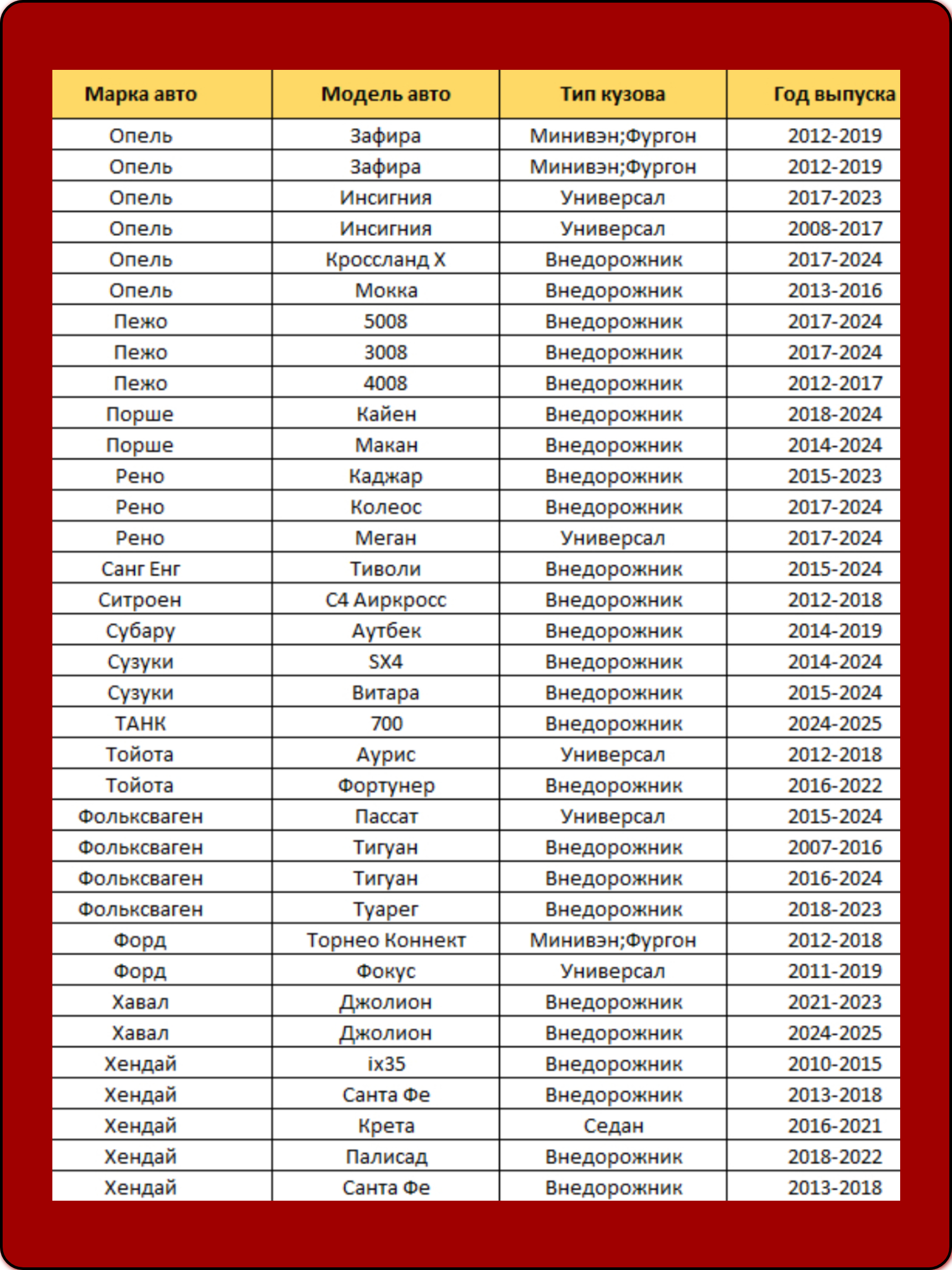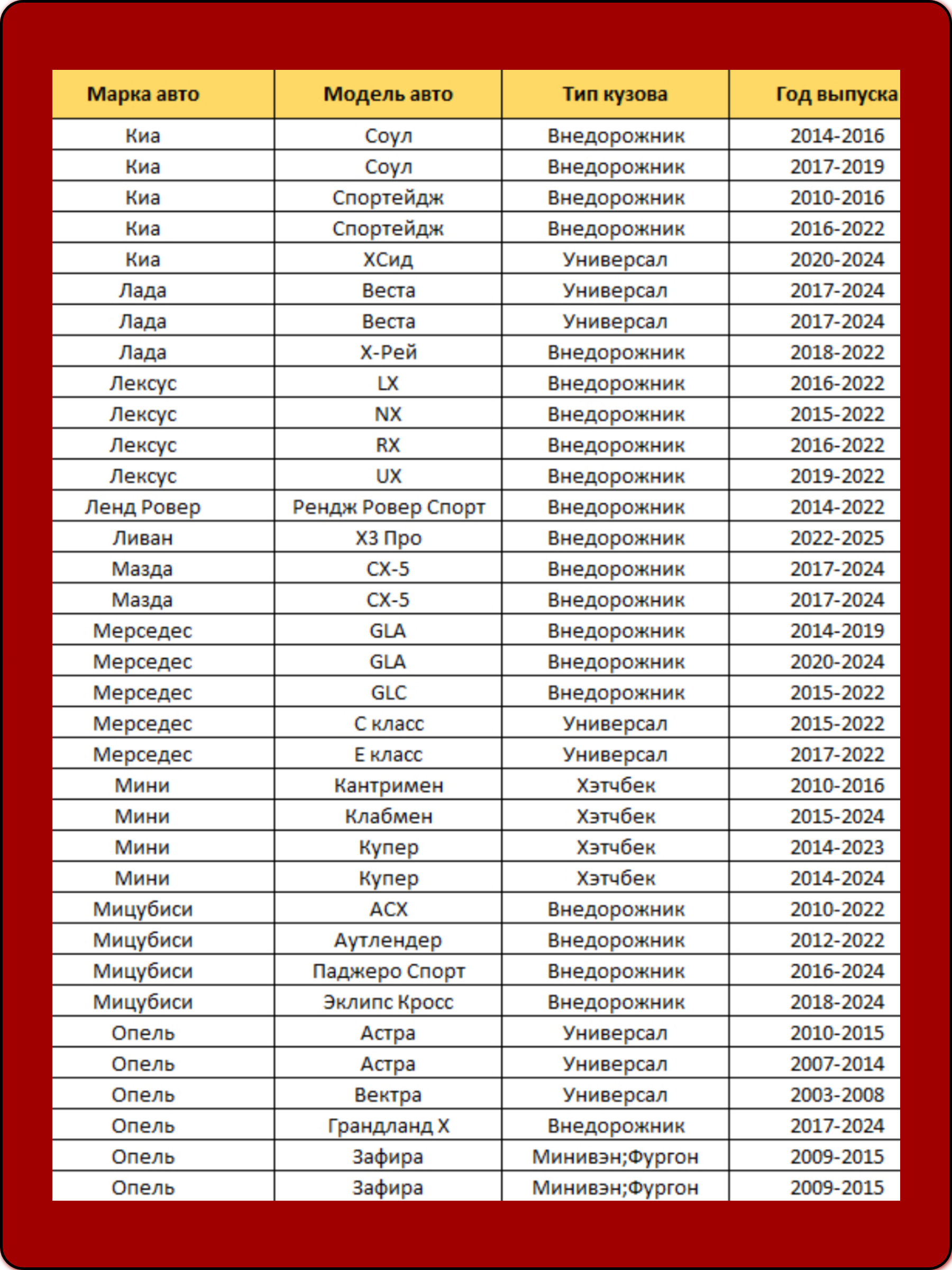 | Марка авто | Модель авто | Тип кузова | Год выпуска | Полное наименование |