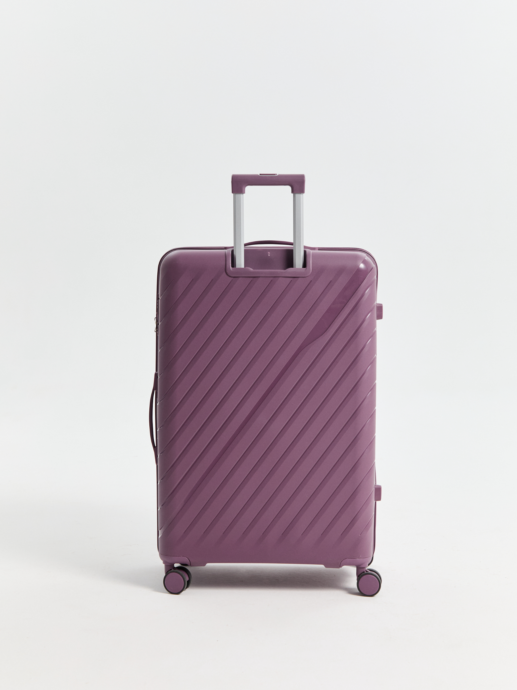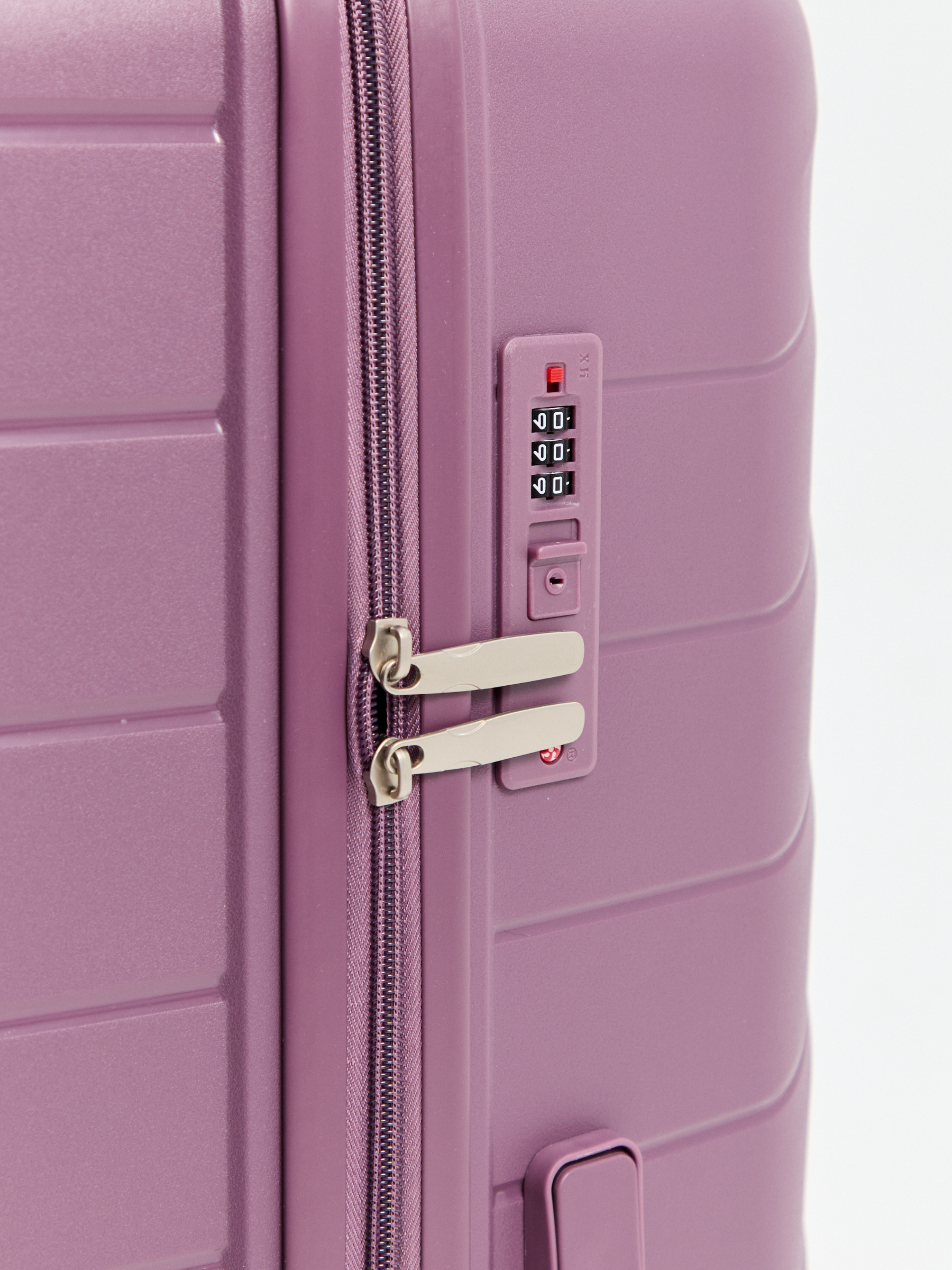 Выдвижная ручка с несколькими уровнями регулировки позволяет удобно переносить чемодан, а кодовый замок защищает содержимое от несанкционированного доступа.