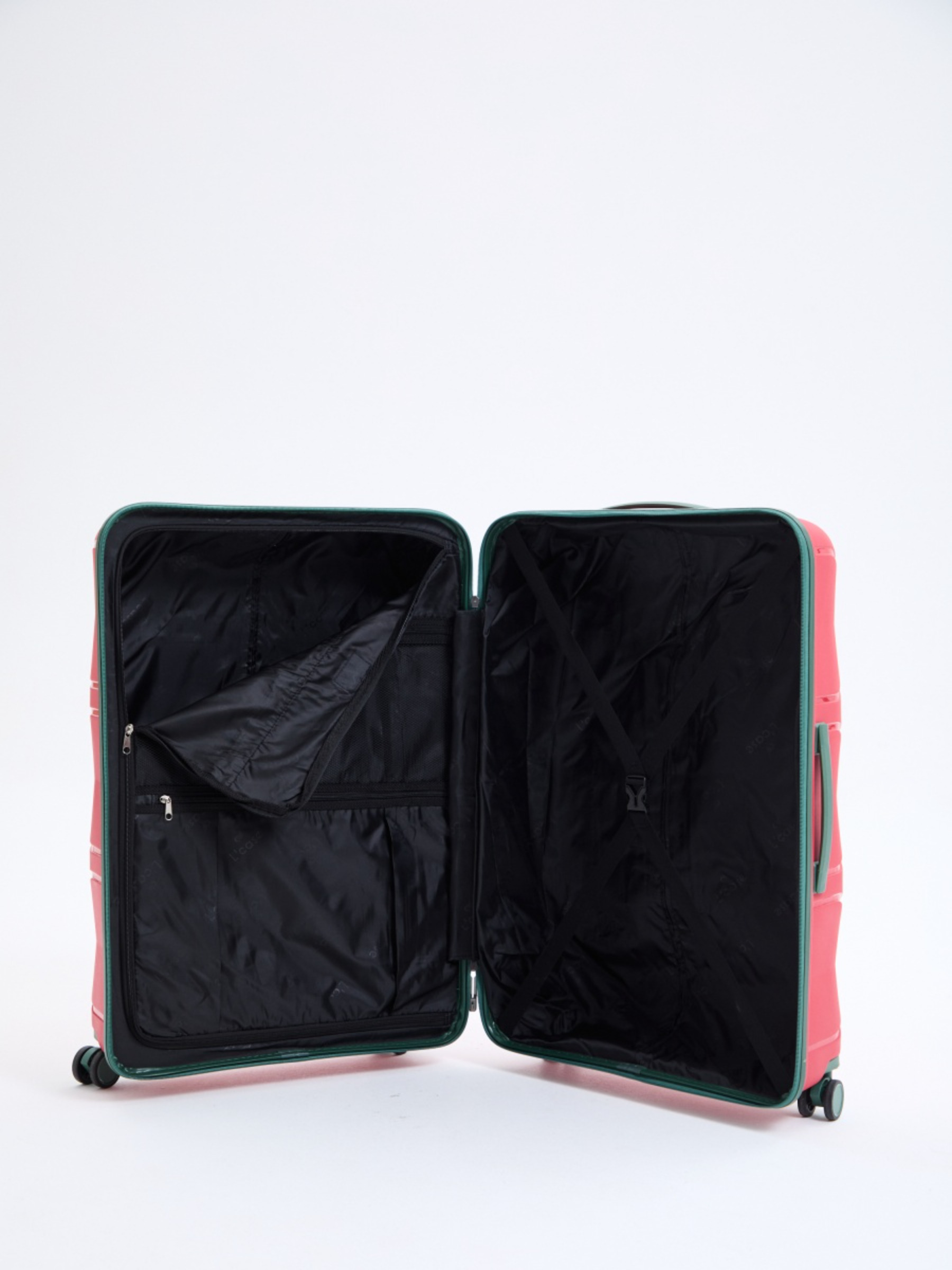 Чемодан MIAMI имеет два внутренних отделения с перегородкой на молнии, внутренний карман на молнии для мелочей и ремни-фиксаторы для вещей.