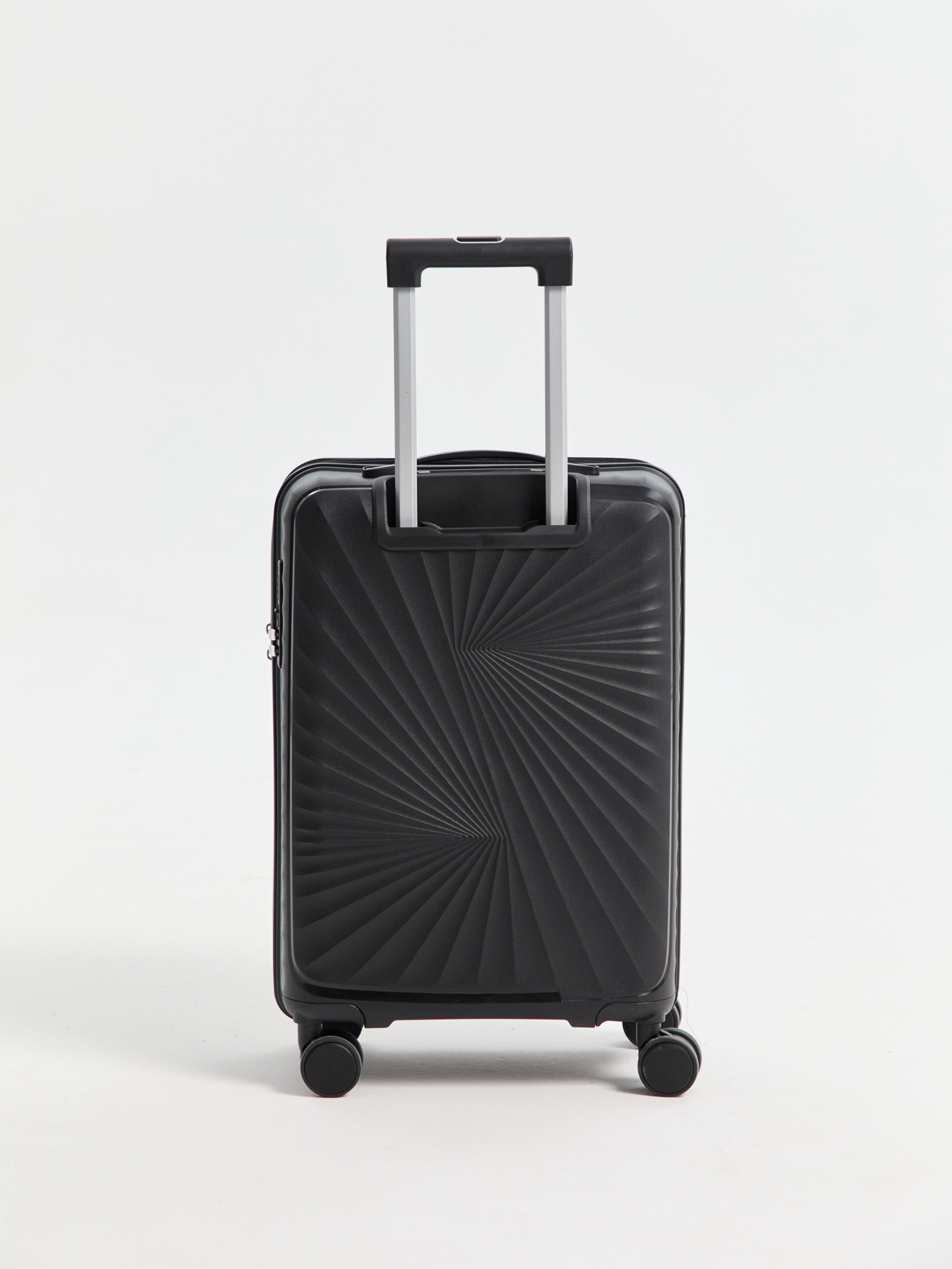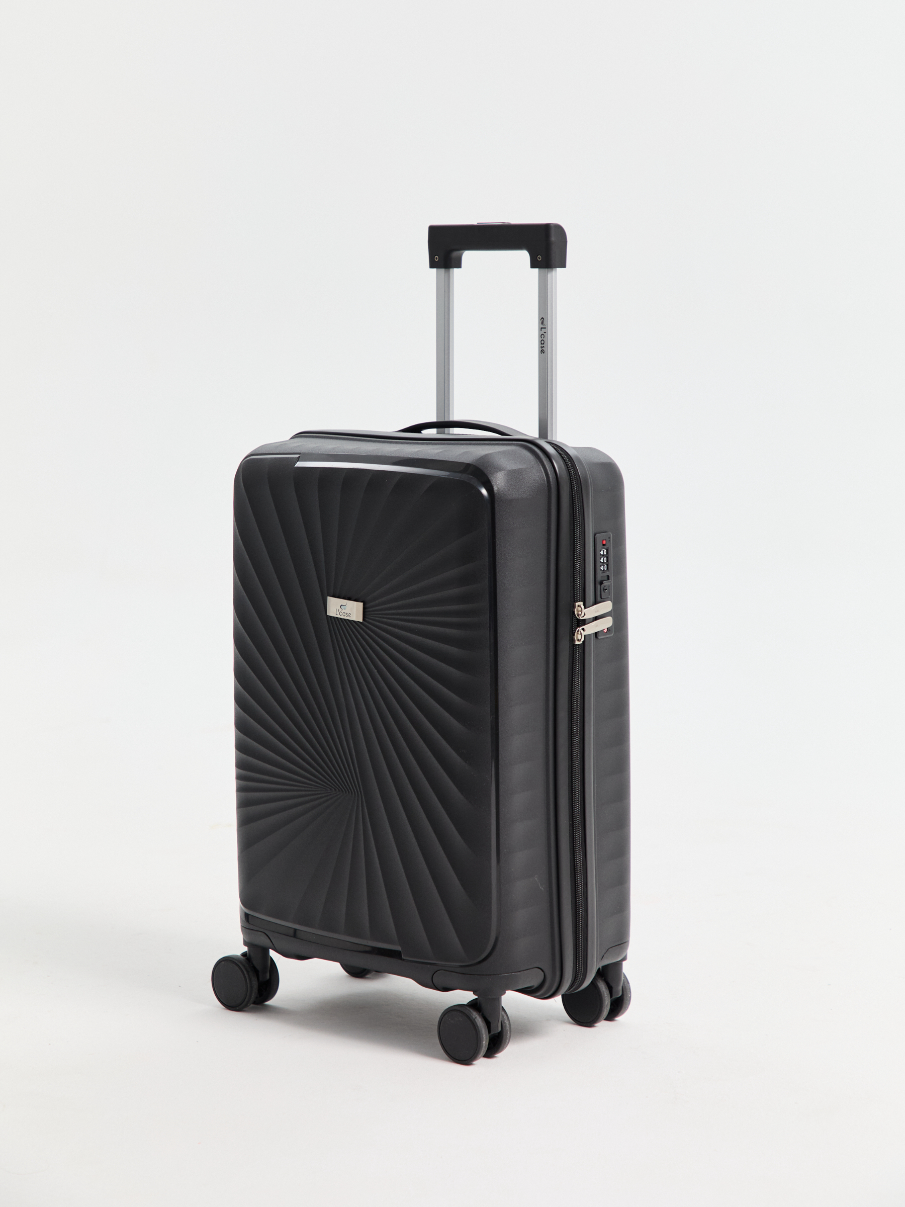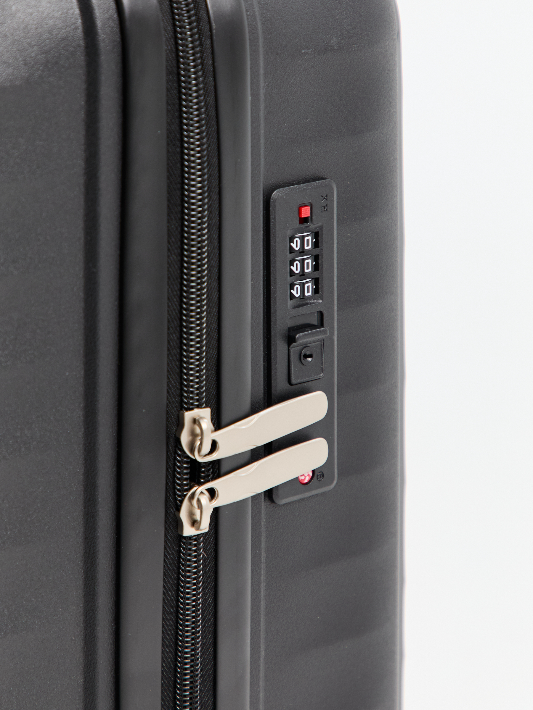 Выдвижная ручка с несколькими уровнями регулировки позволяет удобно переносить чемодан, а кодовый замок защищает содержимое от несанкционированного доступа.