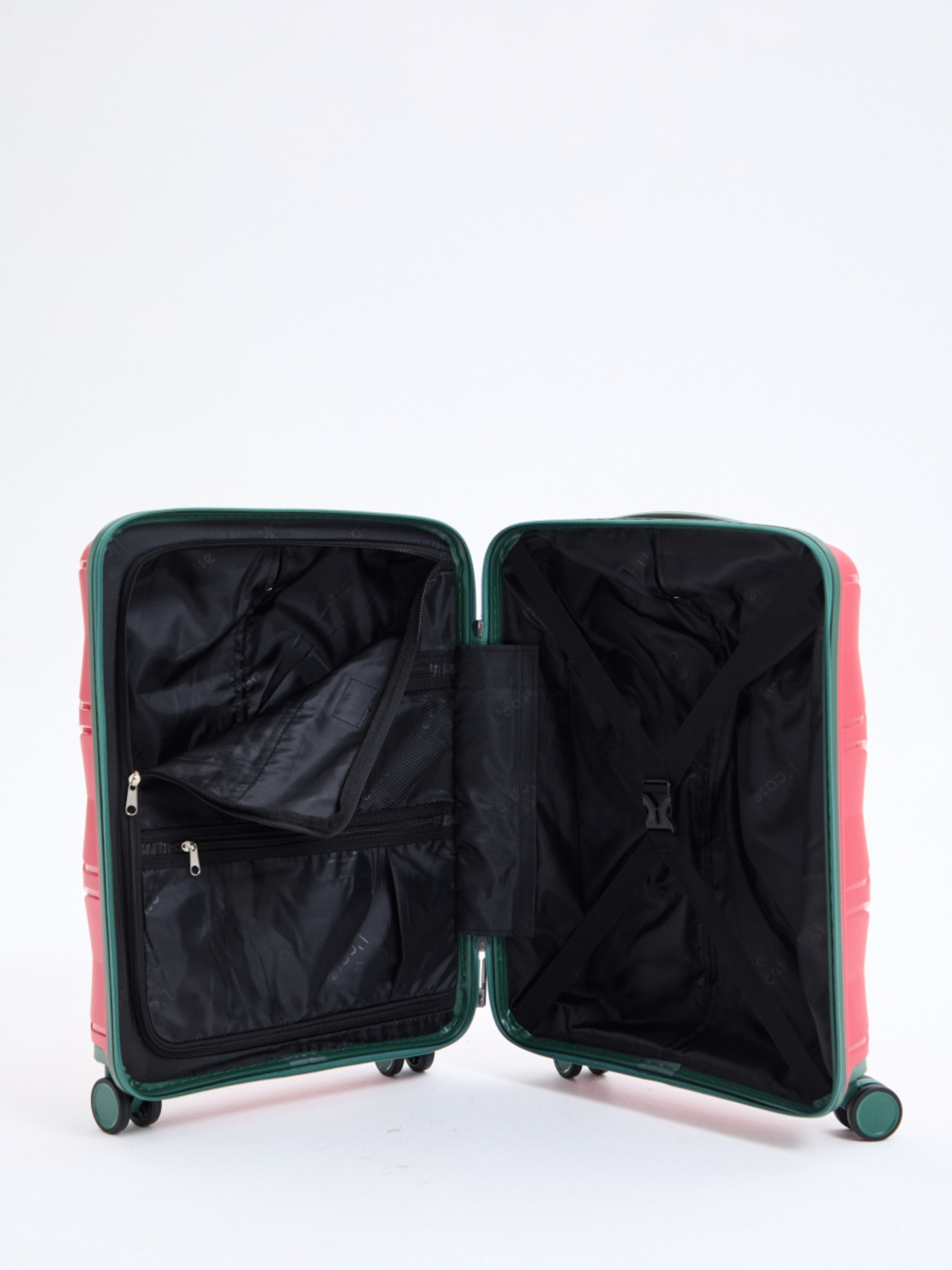 Чемодан MIAMI имеет два внутренних отделения с перегородкой на молнии, внутренний карман на молнии для мелочей и ремни-фиксаторы для вещей.