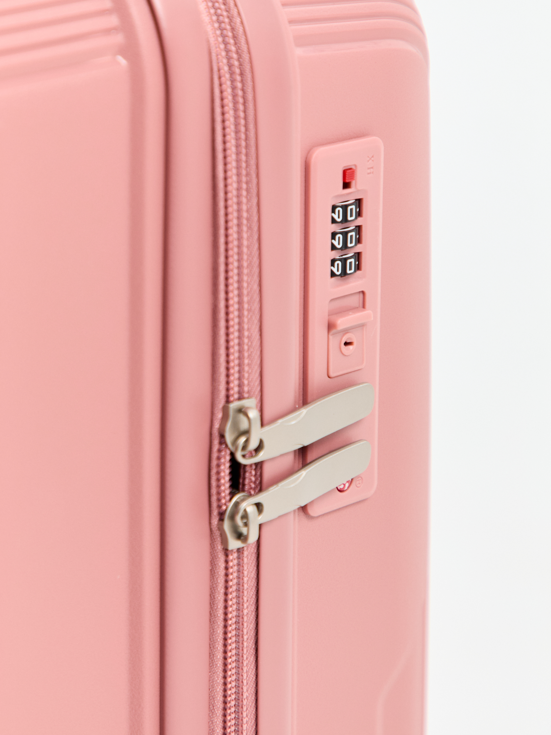 Выдвижная ручка с несколькими уровнями регулировки позволяет удобно переносить чемодан, а кодовый замок защищает содержимое от несанкционированного доступа.