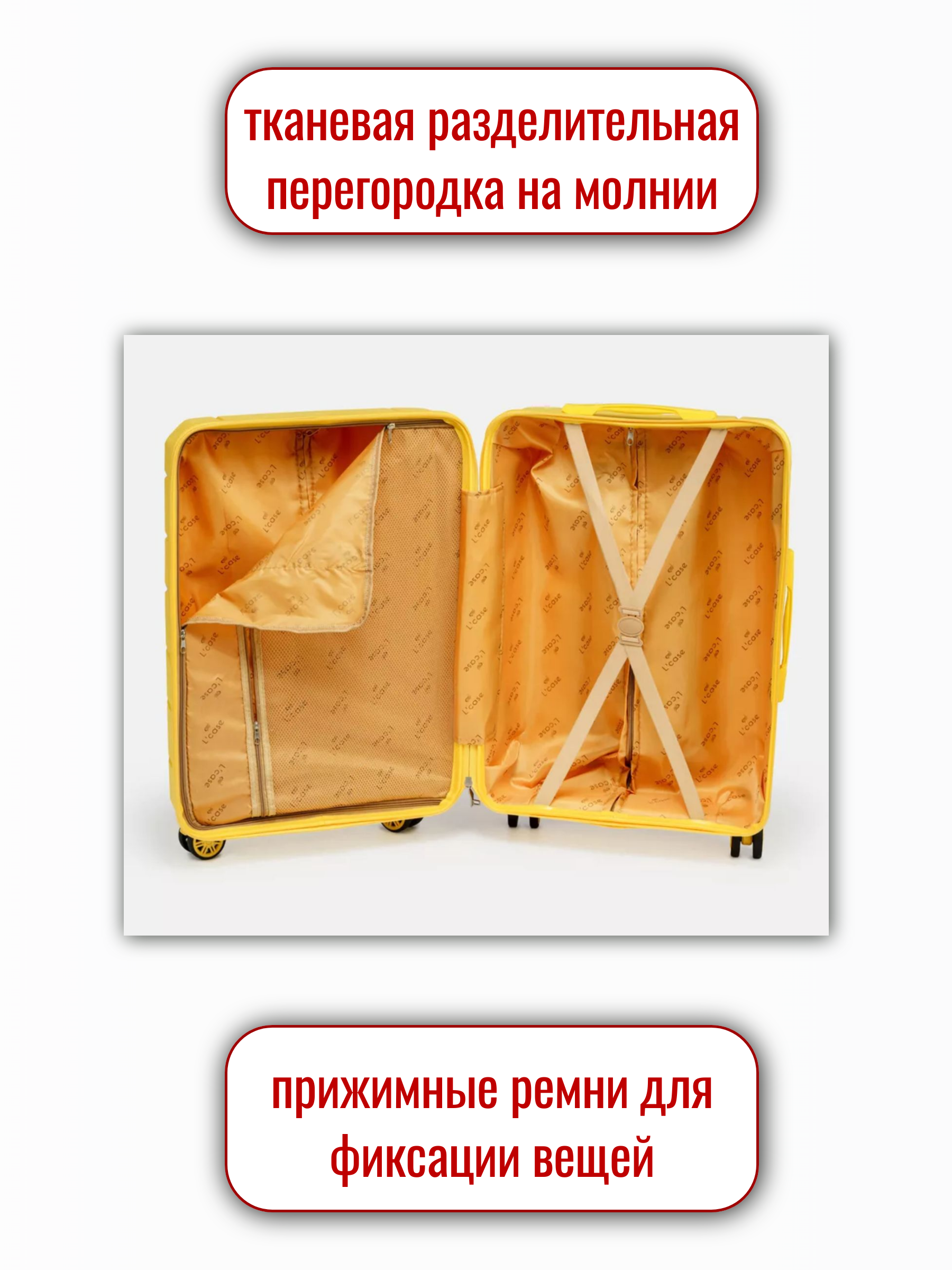 Чемодан SINGAPORE имеет два внутренних отделения с перегородкой на молнии, внутренний карман на молнии для мелочей и ремни-фиксаторы для вещей.