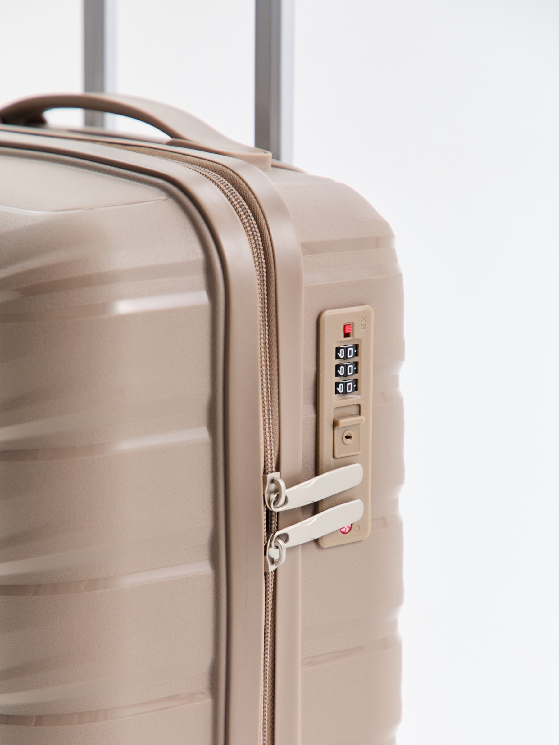 Выдвижная ручка с несколькими уровнями регулировки позволяет удобно переносить чемодан, а кодовый замок защищает содержимое от несанкционированного доступа.