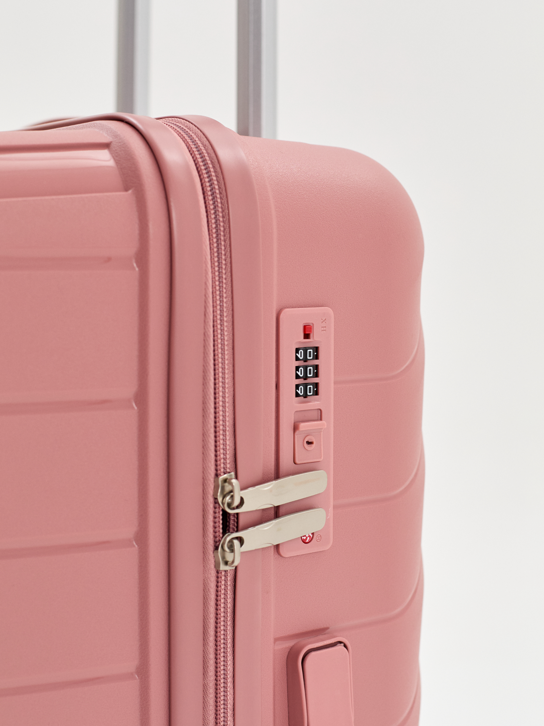 Выдвижная ручка с несколькими уровнями регулировки позволяет удобно переносить чемодан, а кодовый замок защищает содержимое от несанкционированного доступа.