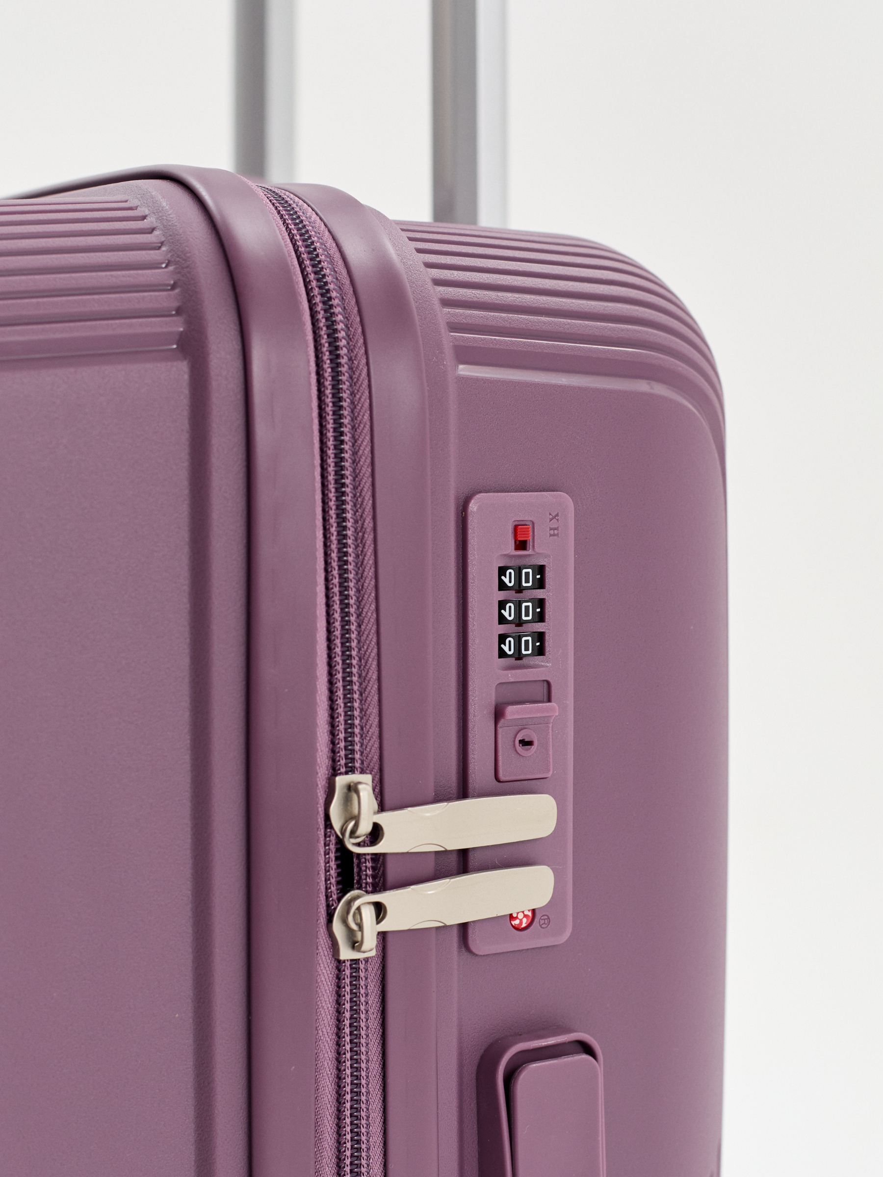 Выдвижная ручка с несколькими уровнями регулировки позволяет удобно переносить чемодан, а кодовый замок защищает содержимое от несанкционированного доступа.