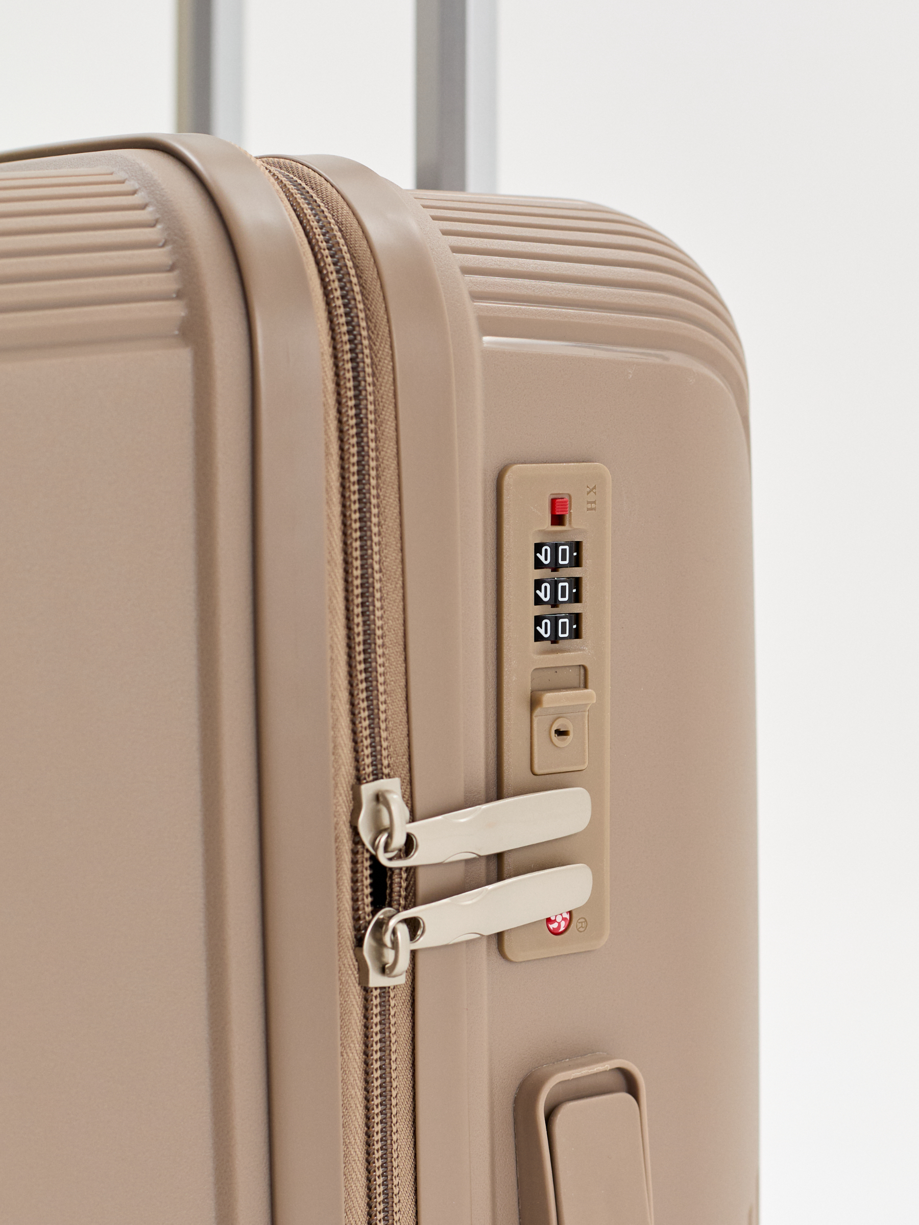 Выдвижная ручка с несколькими уровнями регулировки позволяет удобно переносить чемодан, а кодовый замок защищает содержимое от несанкционированного доступа.