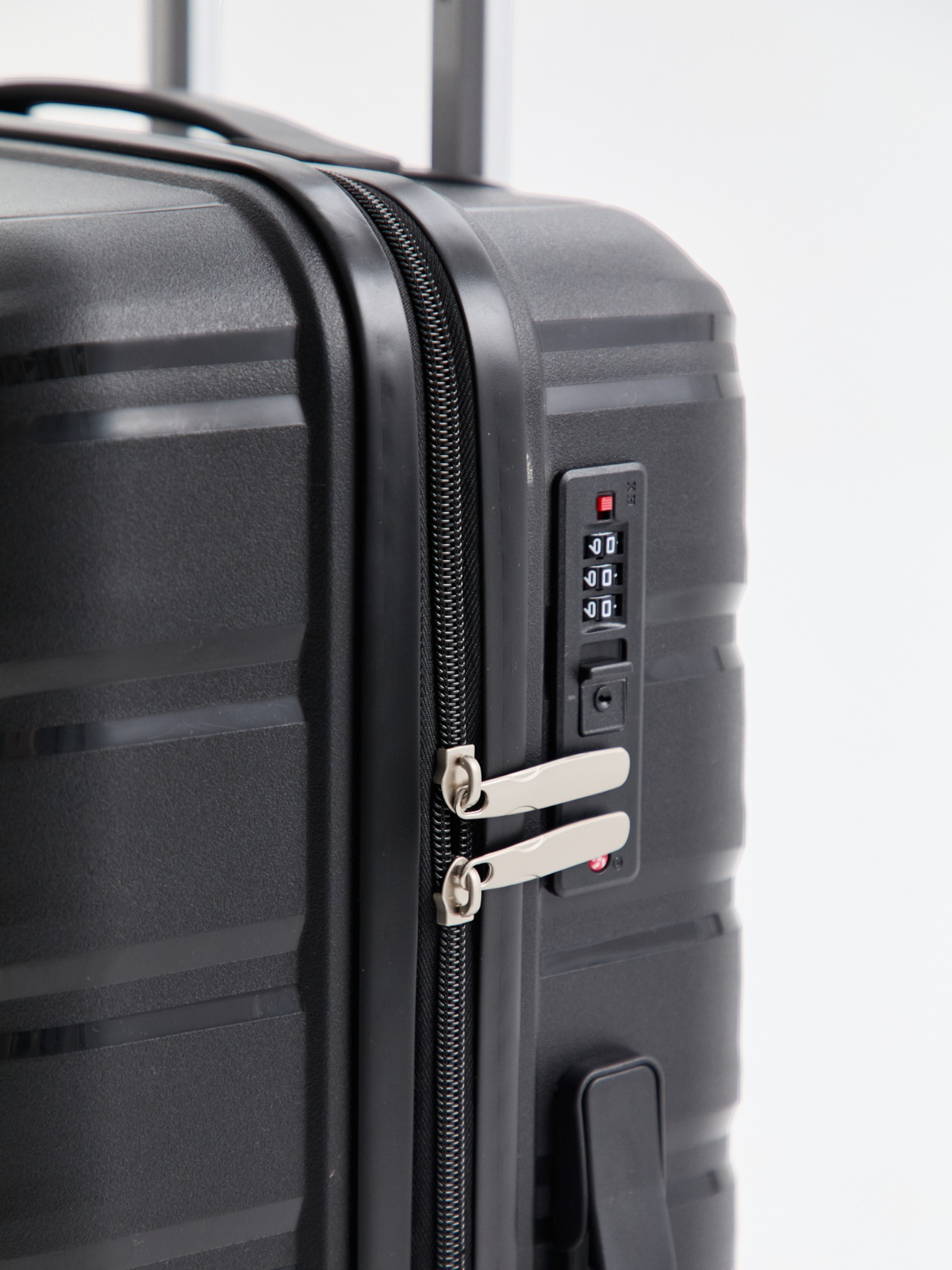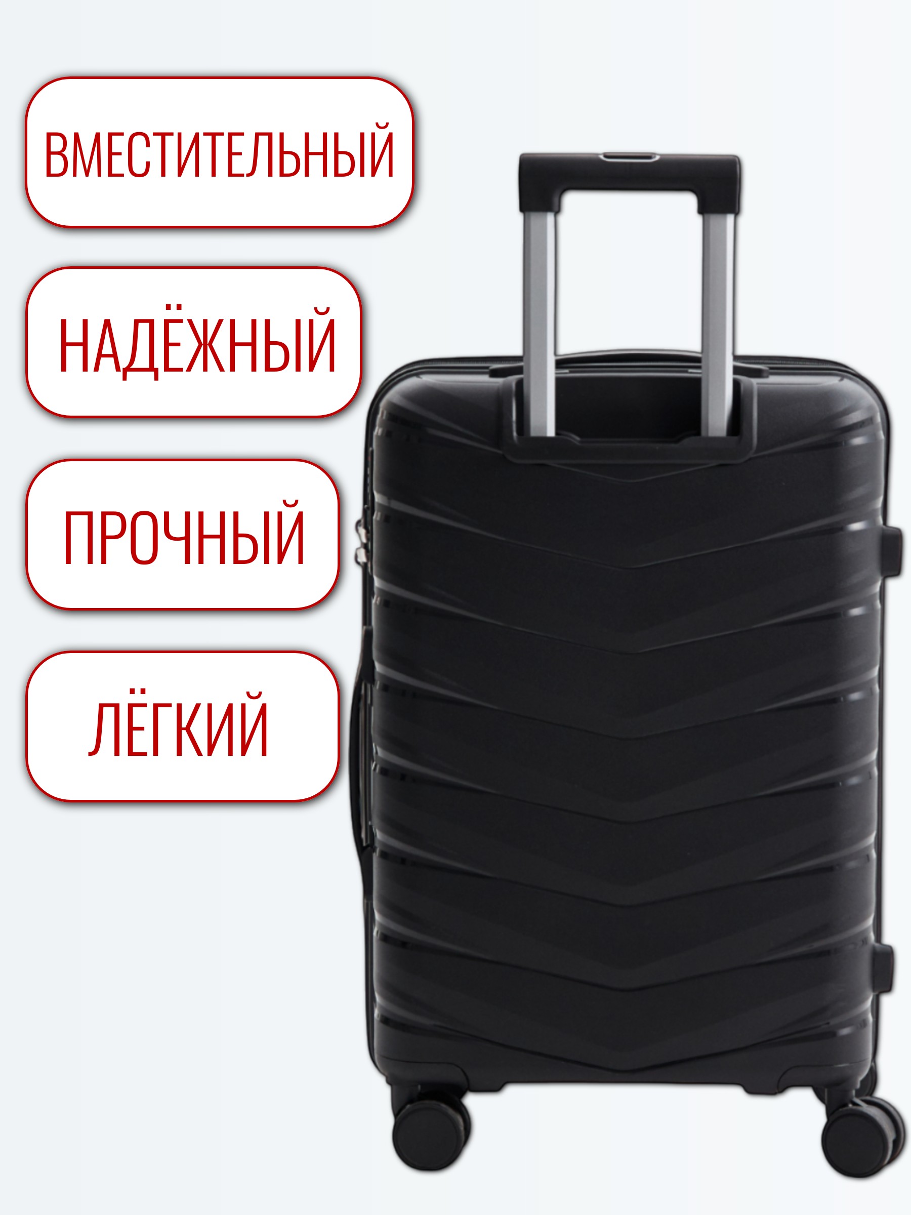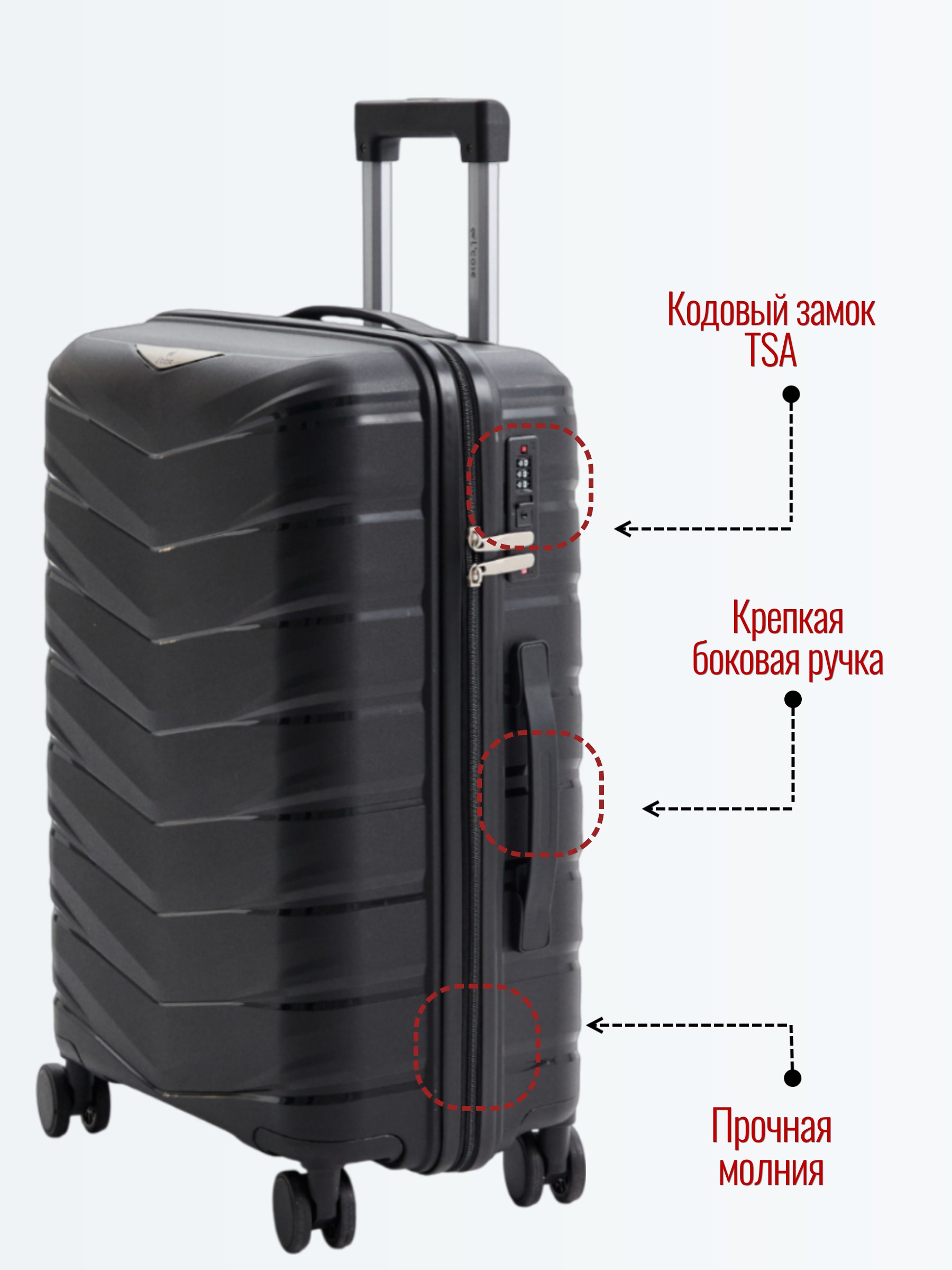 Выдвижная ручка с несколькими уровнями регулировки позволяет удобно переносить чемодан, а кодовый замок защищает содержимое от несанкционированного доступа.