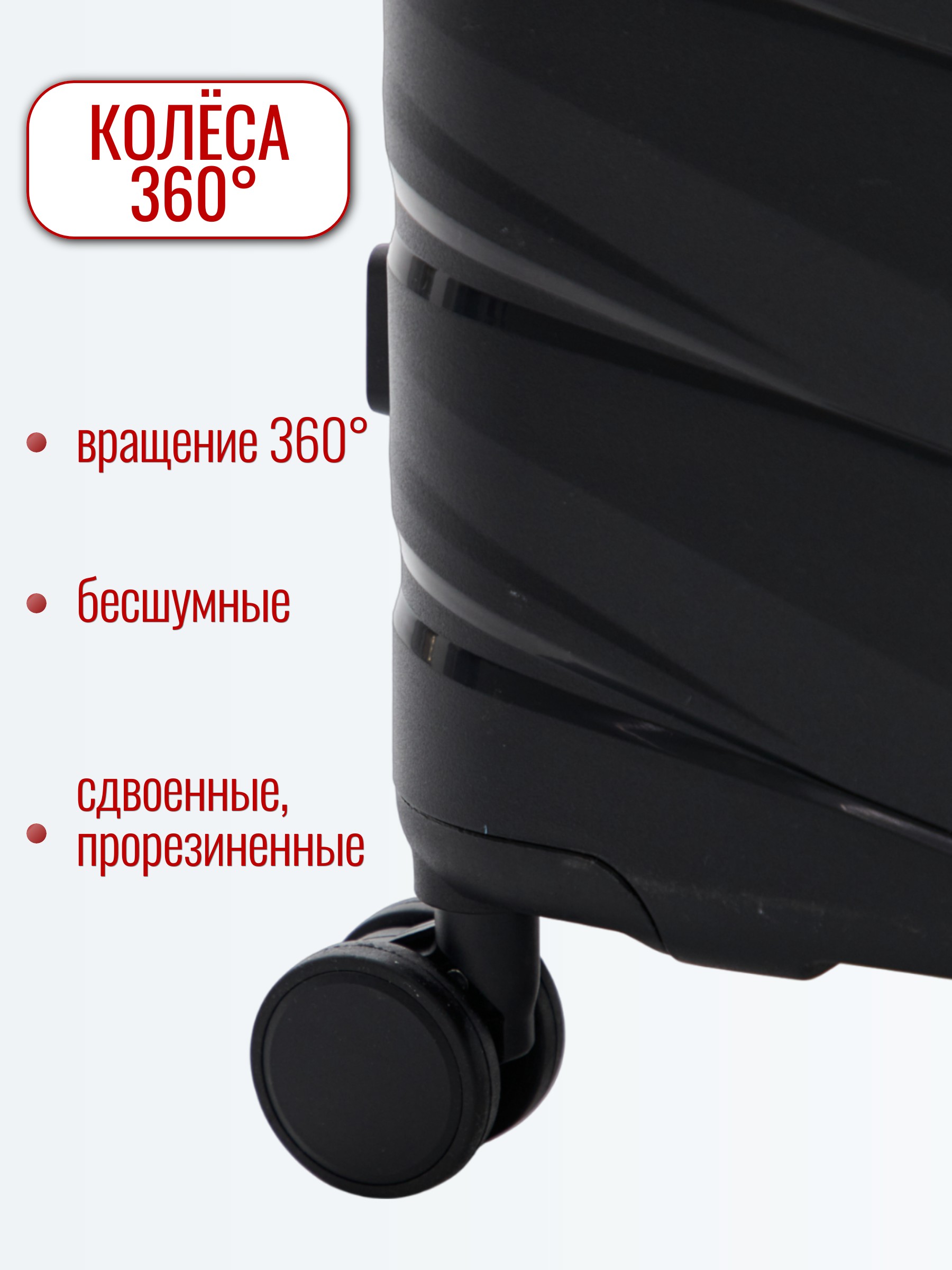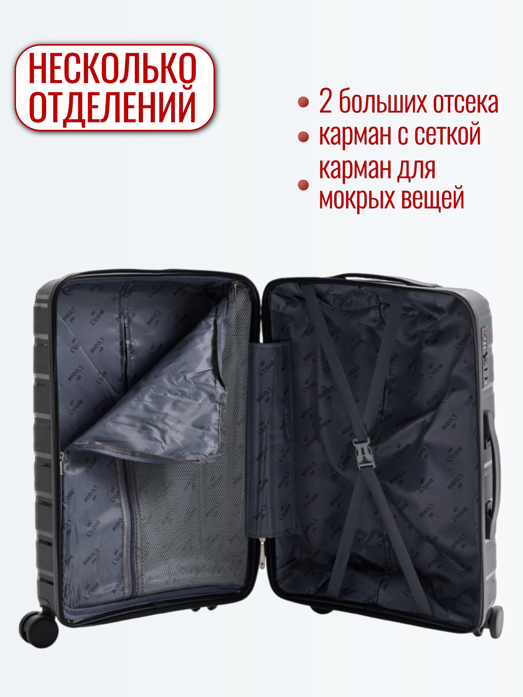 Ремни-фиксаторы надежно удерживают вещи на месте, а четыре двойных колеса обеспечивают плавное и легкое маневрирование на 360 градусов.