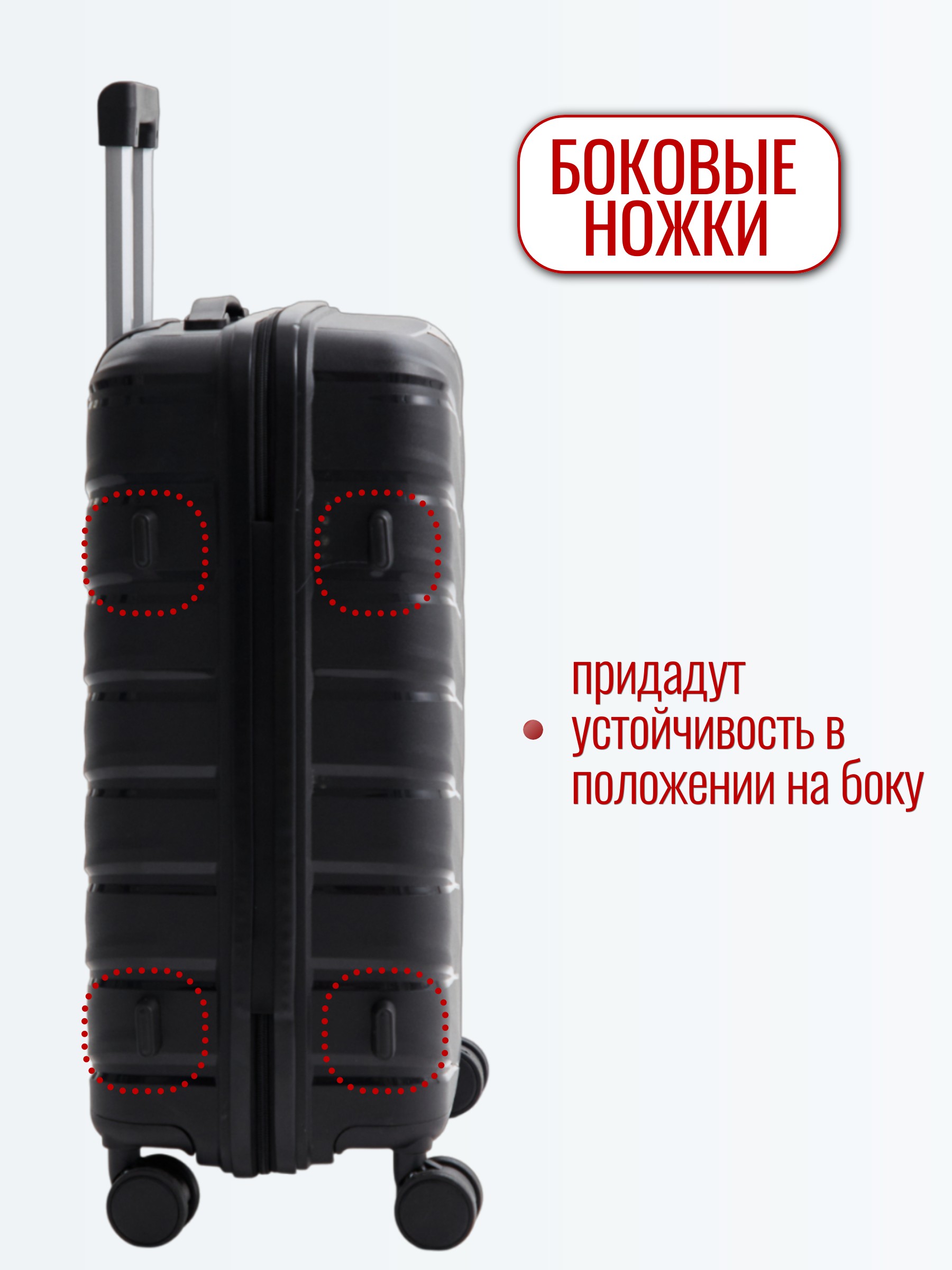 Выдвижная ручка: да. Боковая ручка: да. Количество колёс: 4. Колеса 360°: да.