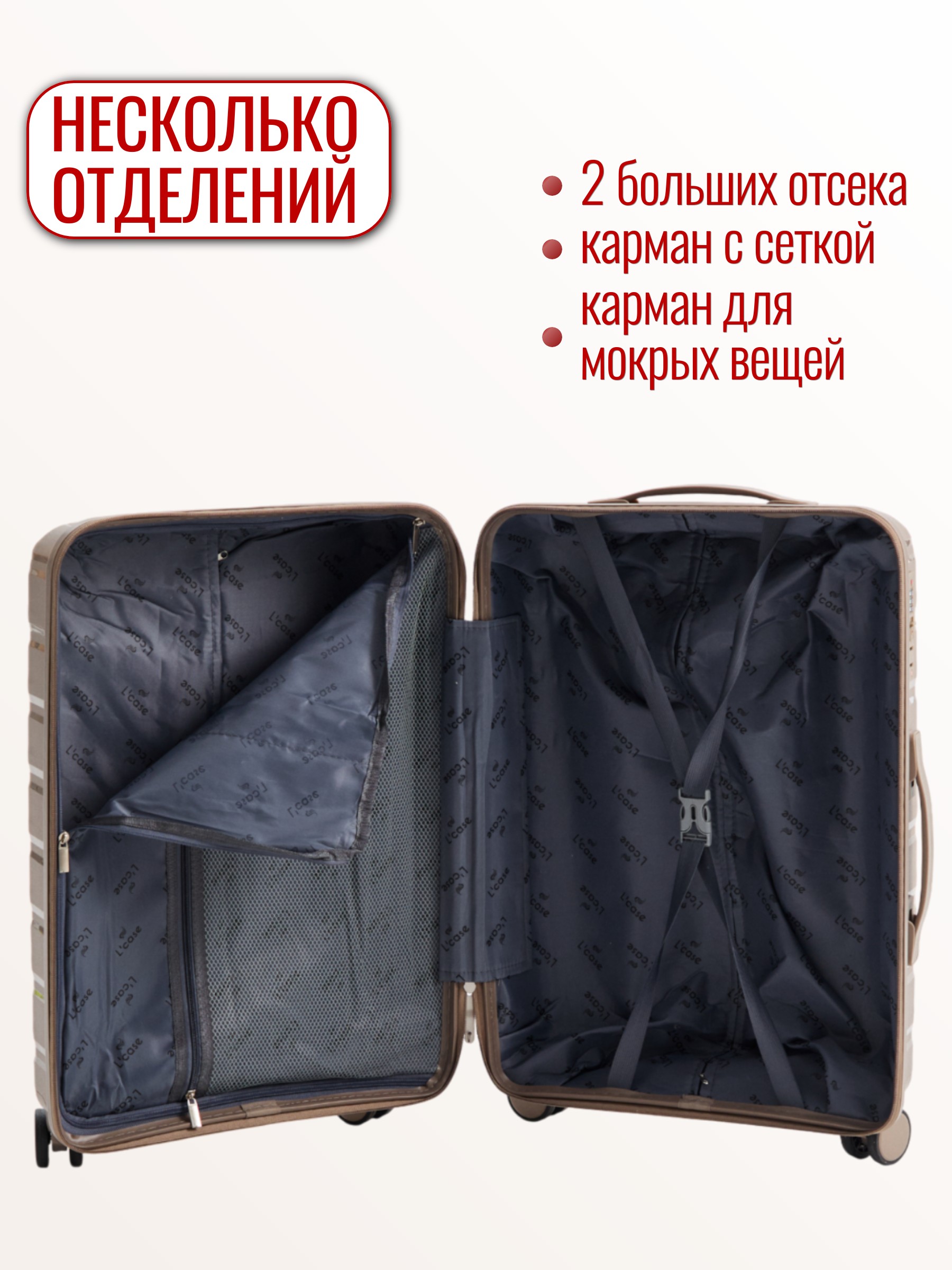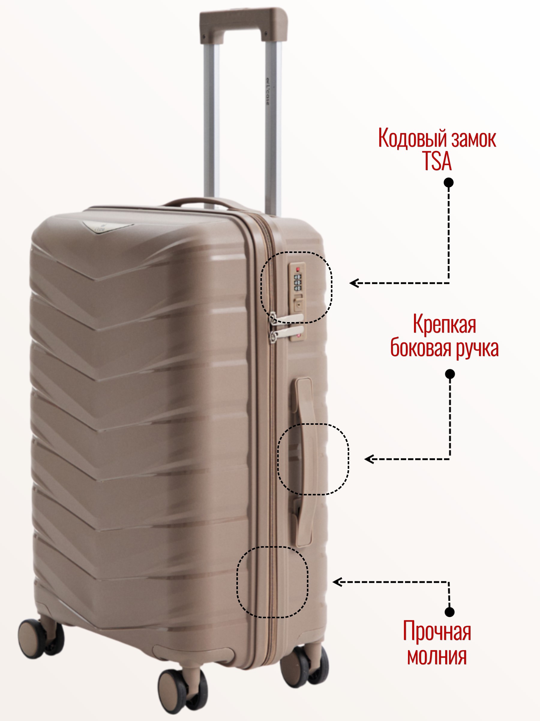 Чемодан Valencia от L’case выполнен из прочного полипропилена, который отличается легкостью и устойчивостью к механическим повреждениям.