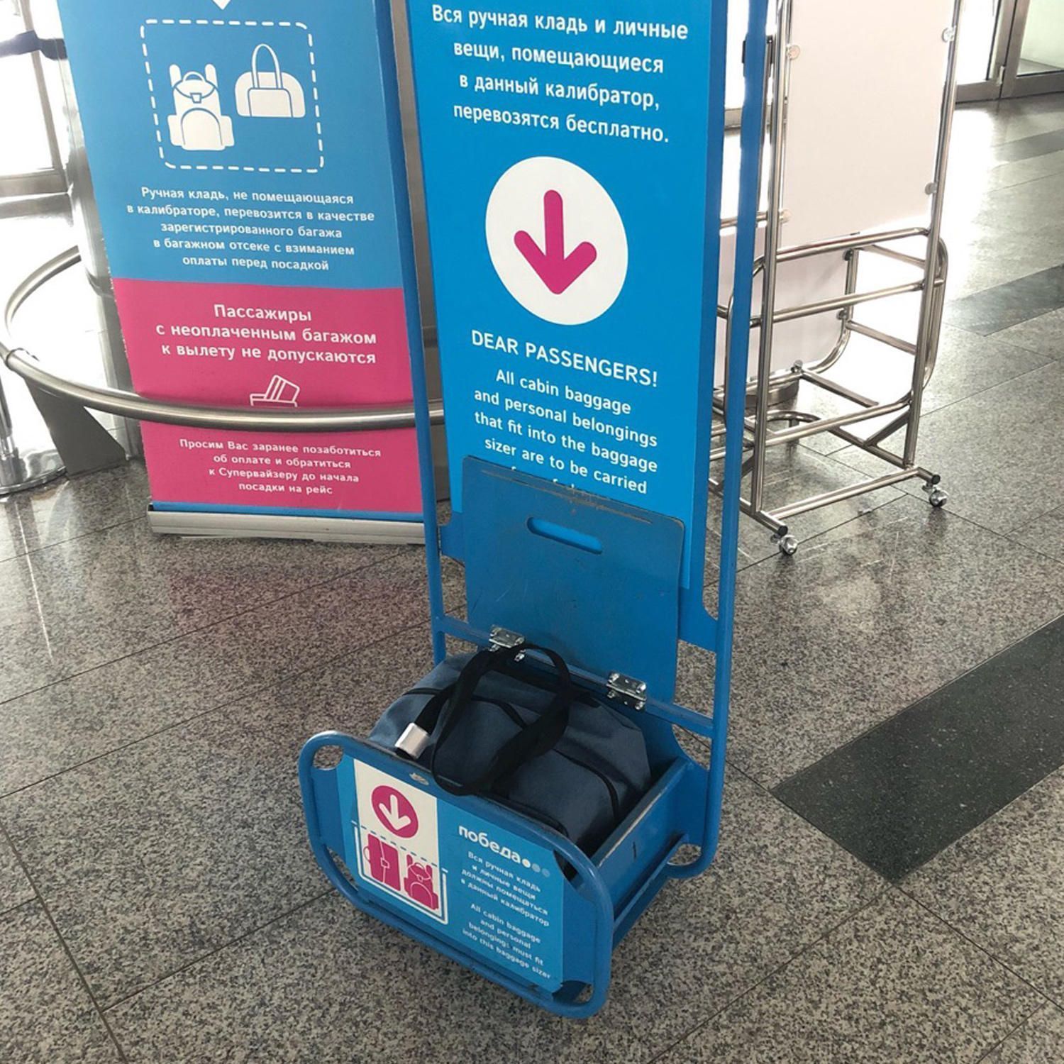 Удобная дорожная сумка разработана специально для ручной клади авиакомпании «Победа». Наружные габариты сумки этой модели 35x29x26 соответствуют внутренним размерам калибратора в аэропорту. Сумка, заполненная вещами, гарантированно пройдет предполетный контроль.