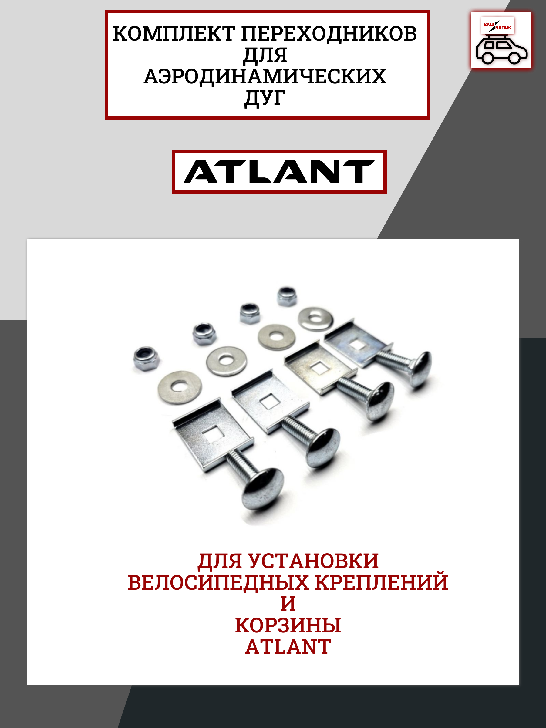 На винт и крепится необходимое изделие или доп. оборудование (велокрепление, корзина, бокс и пр.). После этого изделие фиксируется гайкой с шайбой.