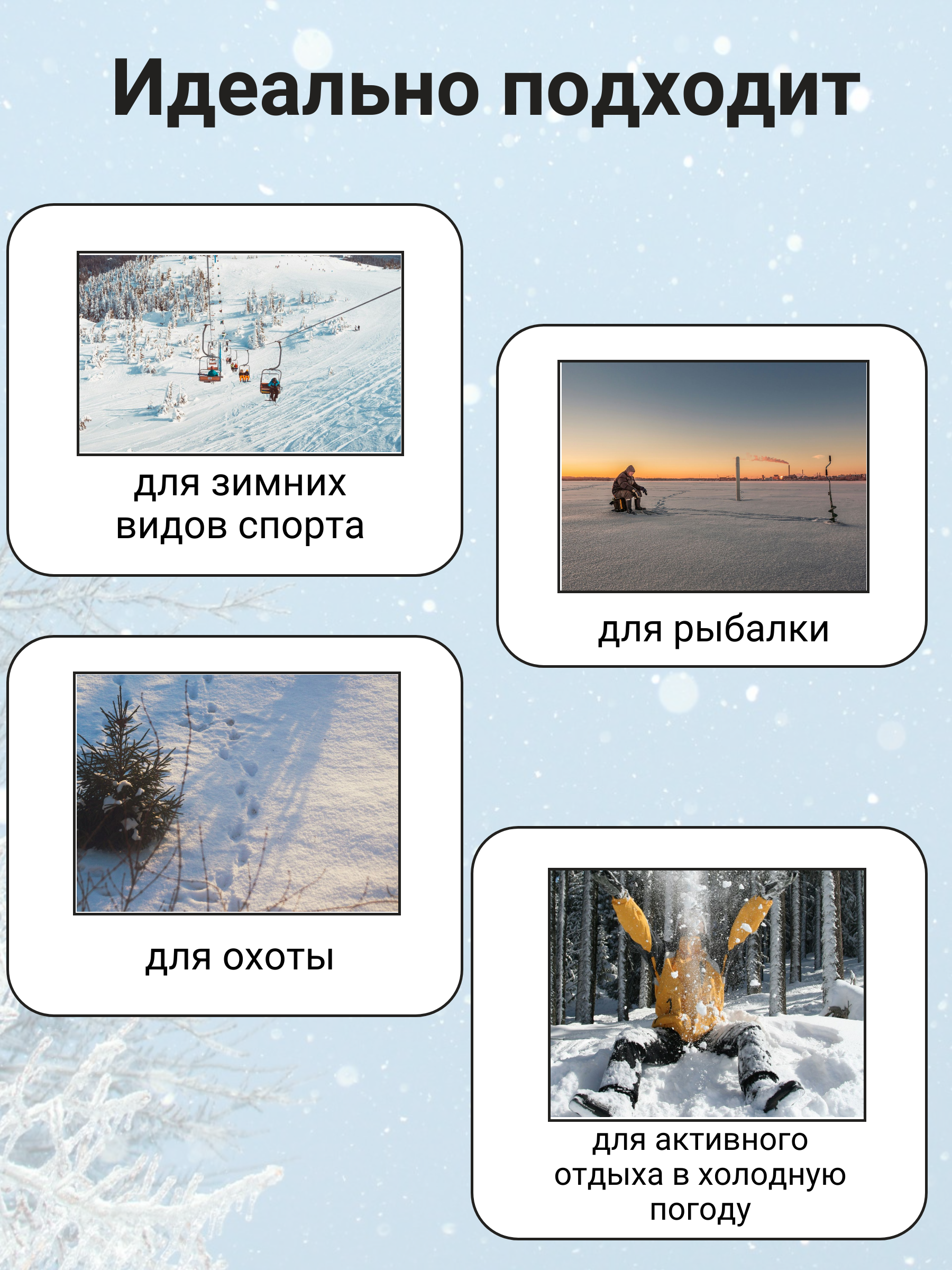 Назанчение: охота, рыбалка, туризм (белье для бивака и сна), тактическое использование, зимний спорт , город.