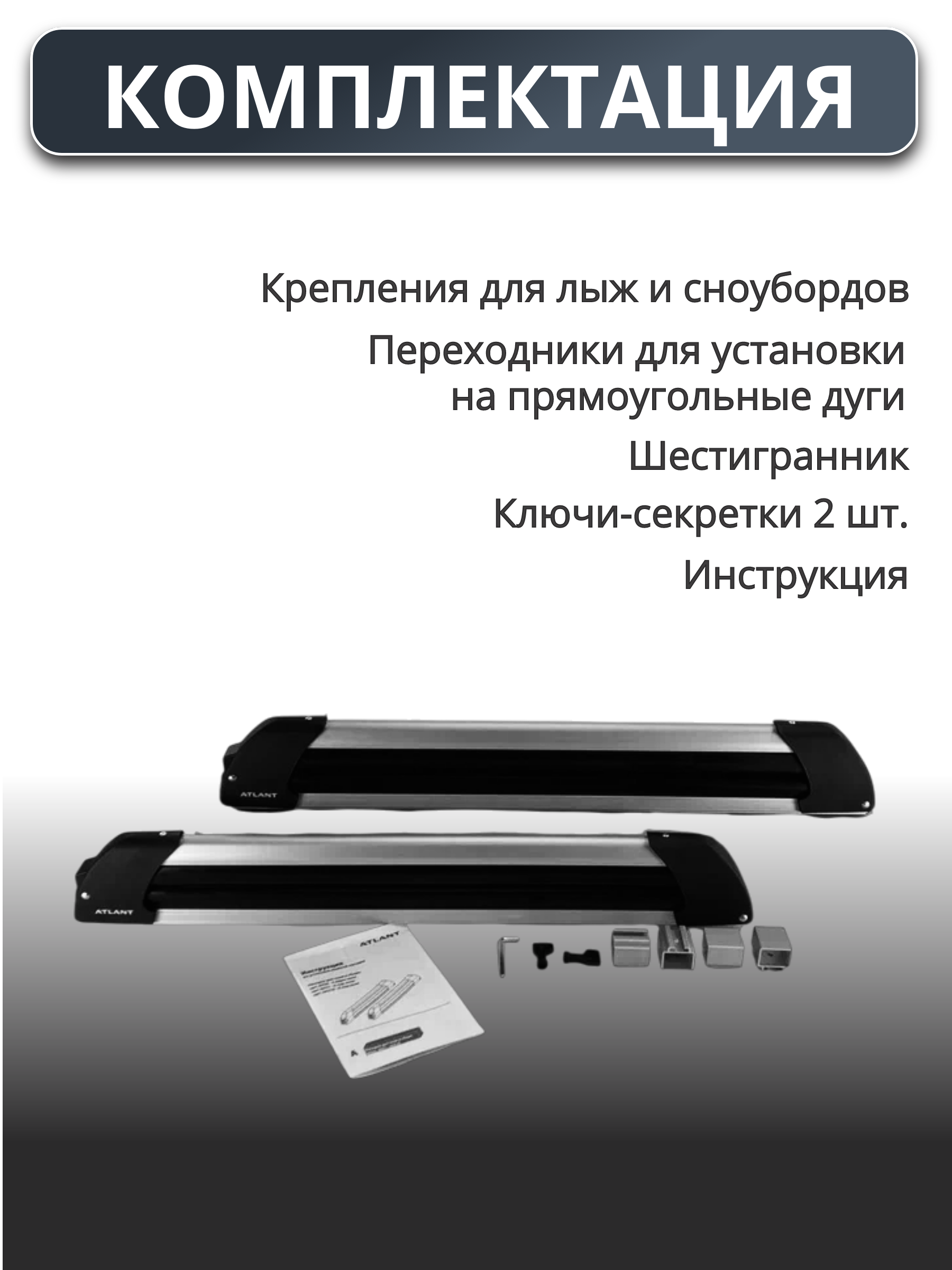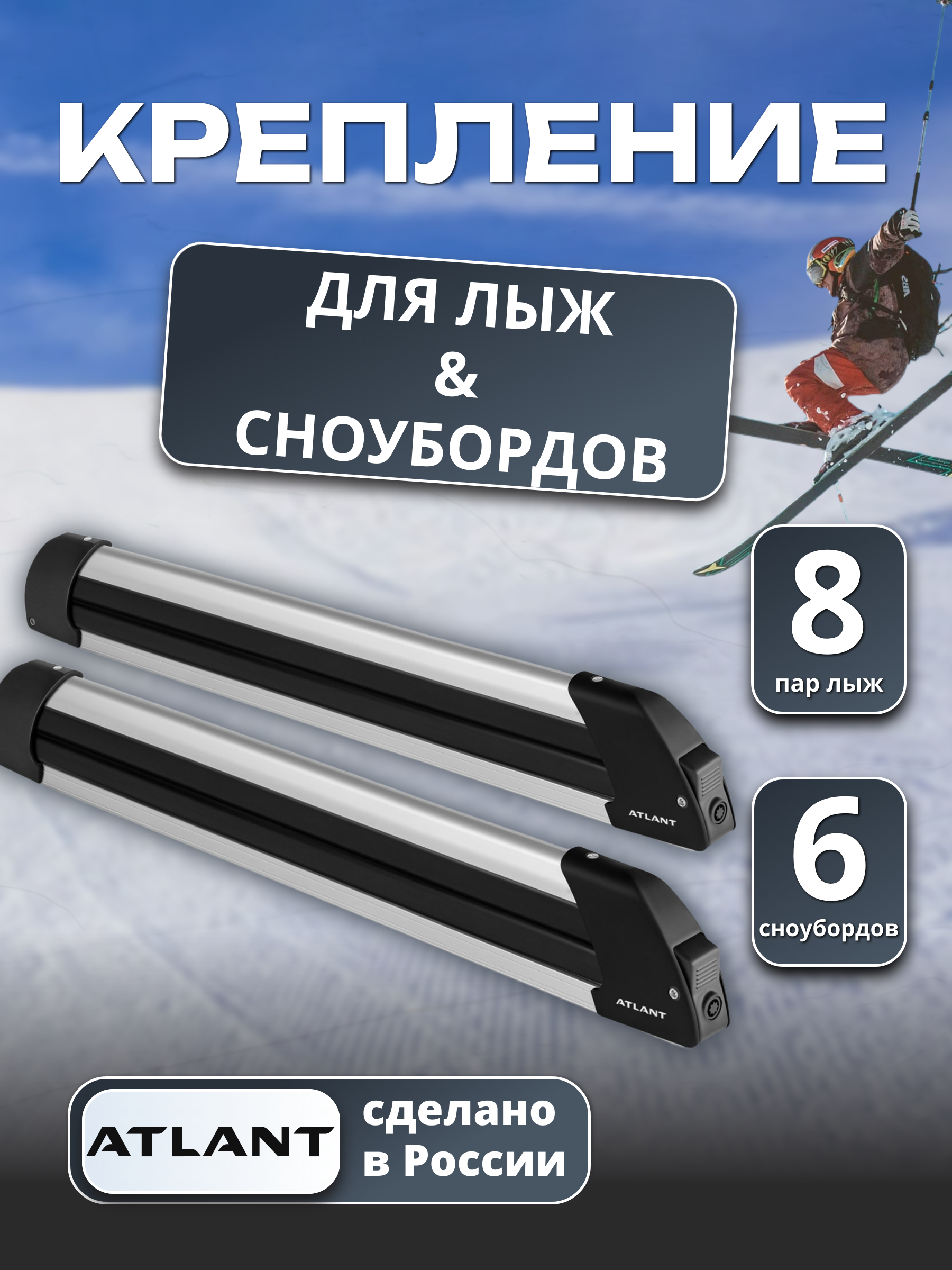 Крепления для лыж и сноубордов спроектированы и произведены с учетом особенностей российского климата и дорог. Они изготовлены из алюминия, что придаёт им легкость, одновременно гарантируя защиту от коррозии.