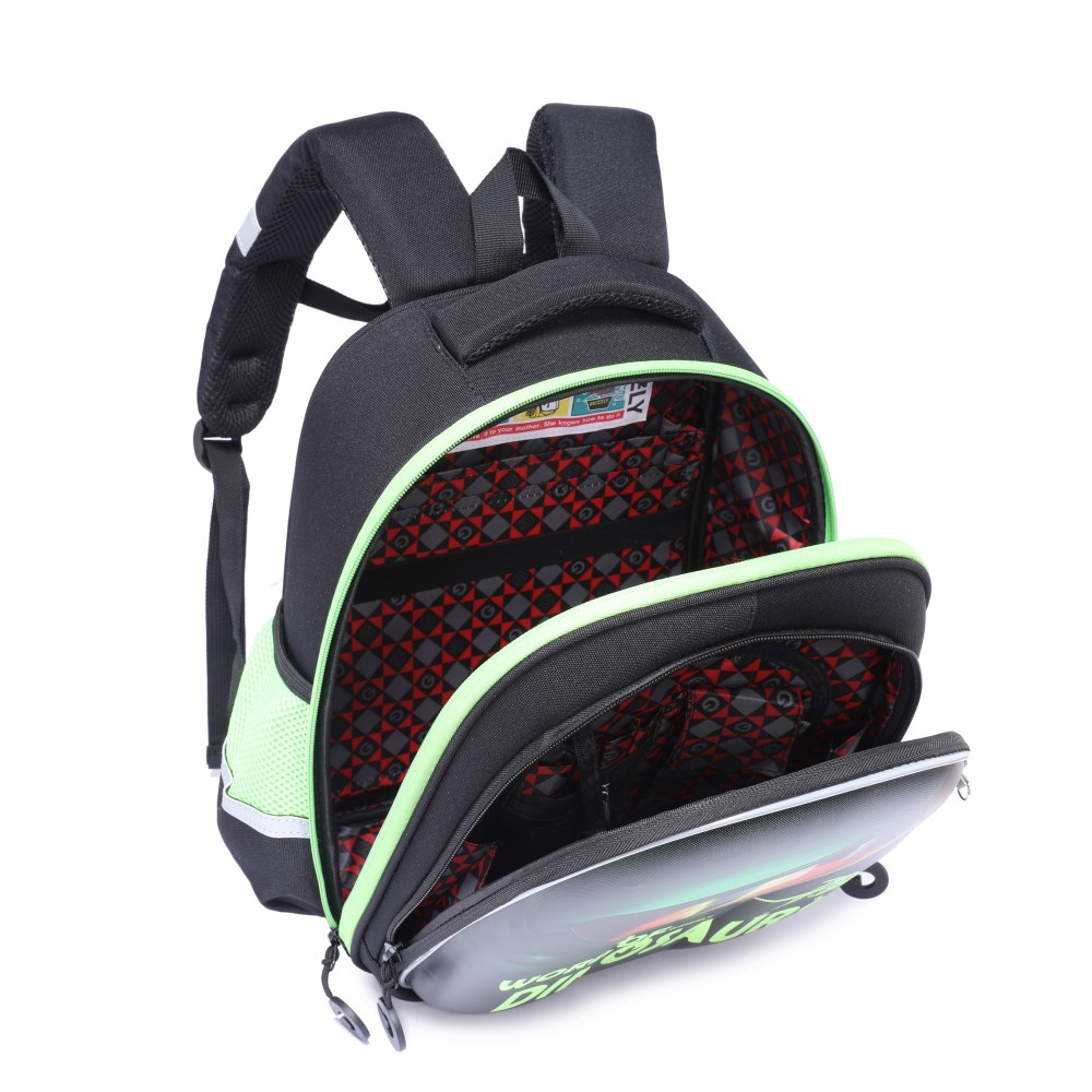 Основное отделение разбито на три отсека: для книг, тетрадей и папок до А4. В дополнительное помещается сменка (есть три кармашка для мелочей).