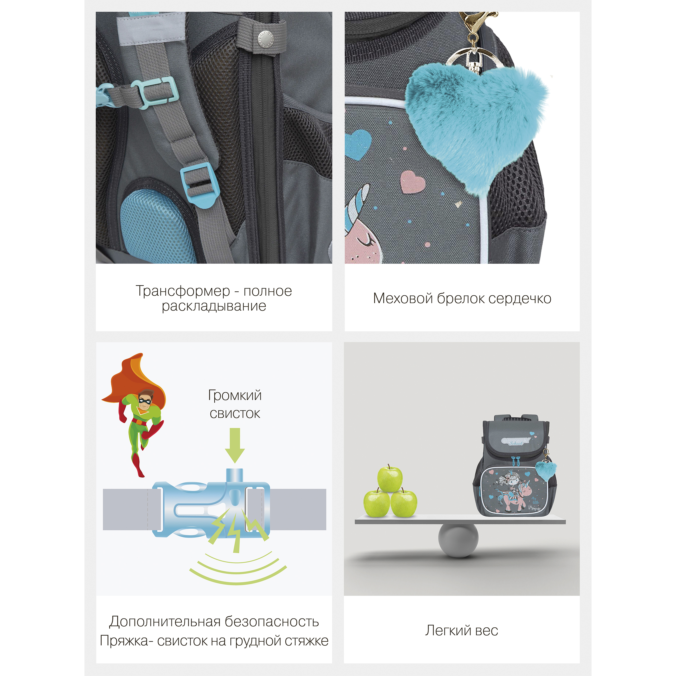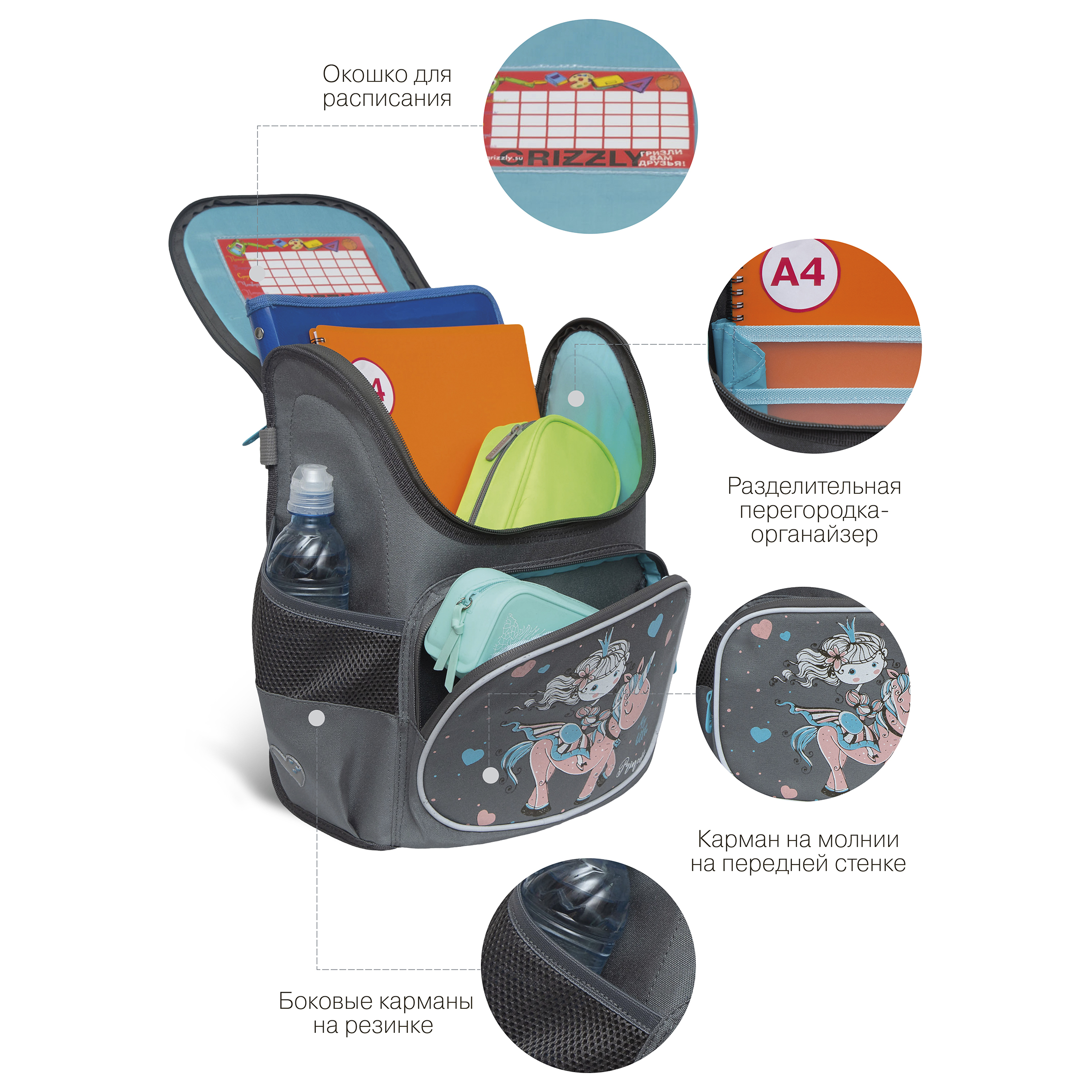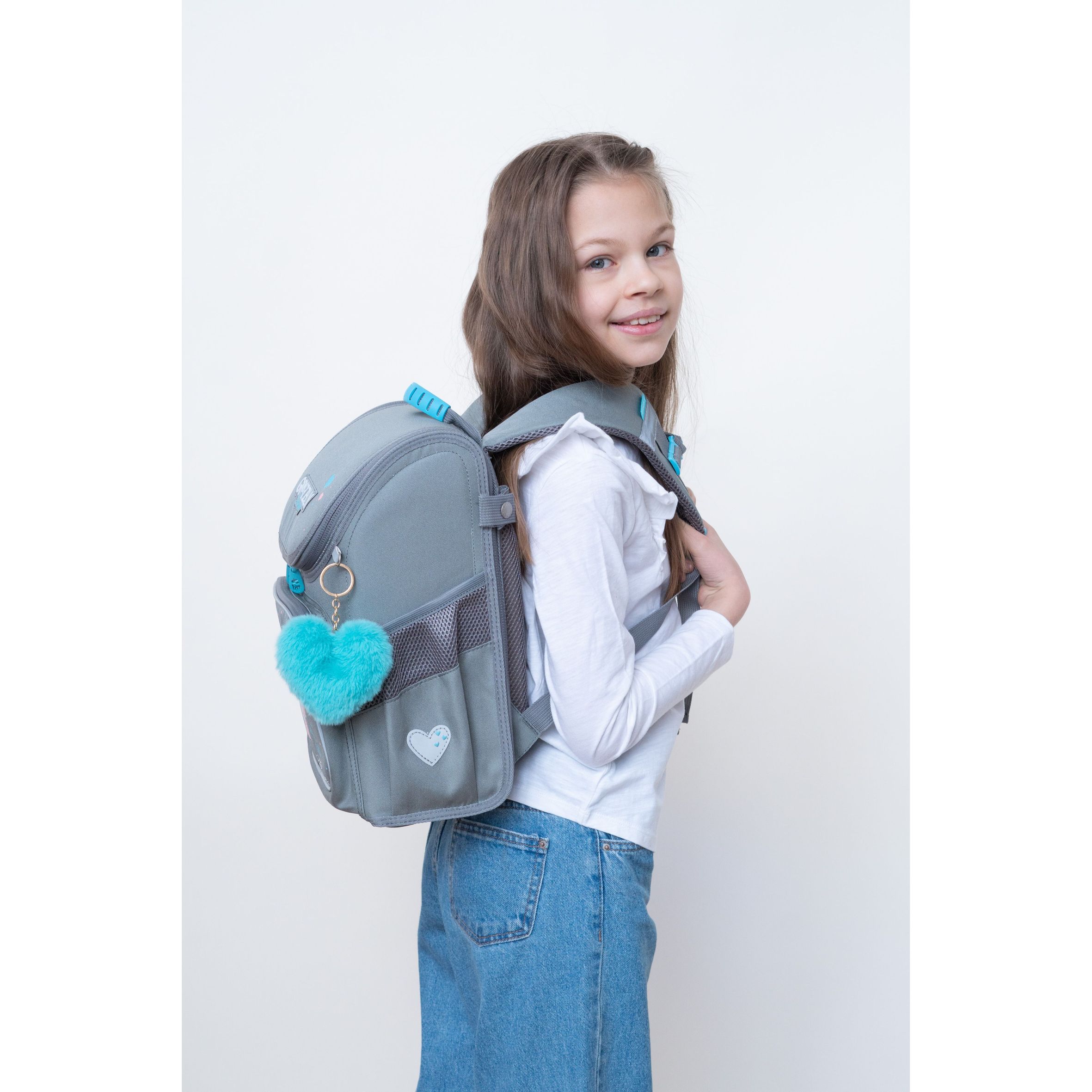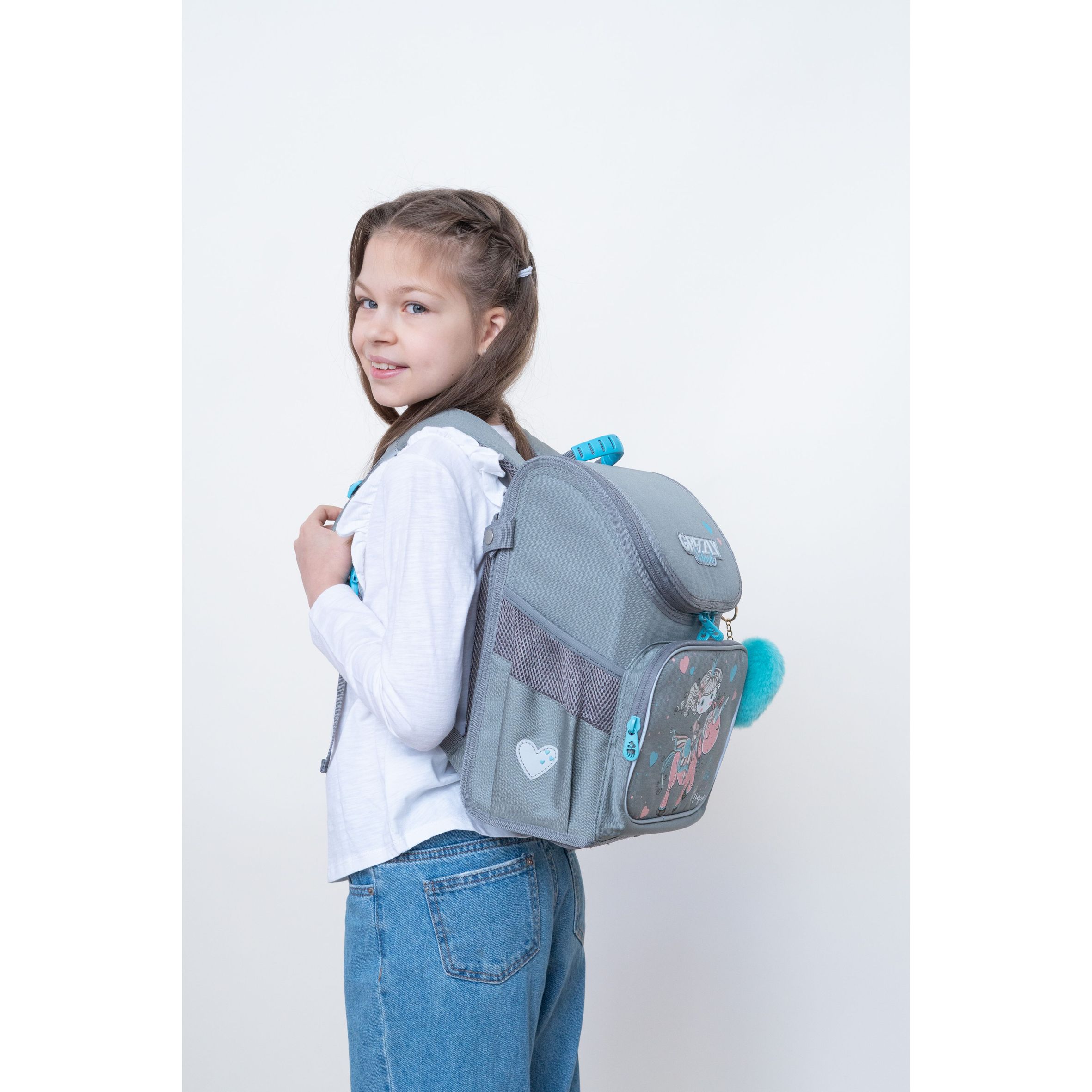 У ранца одно большое отделение с разделителем для учебных пособий формата А4, передний карман на молнии для мелочей, твердое дно с резиновыми ножками и два вместительных боковых кармана. <br>