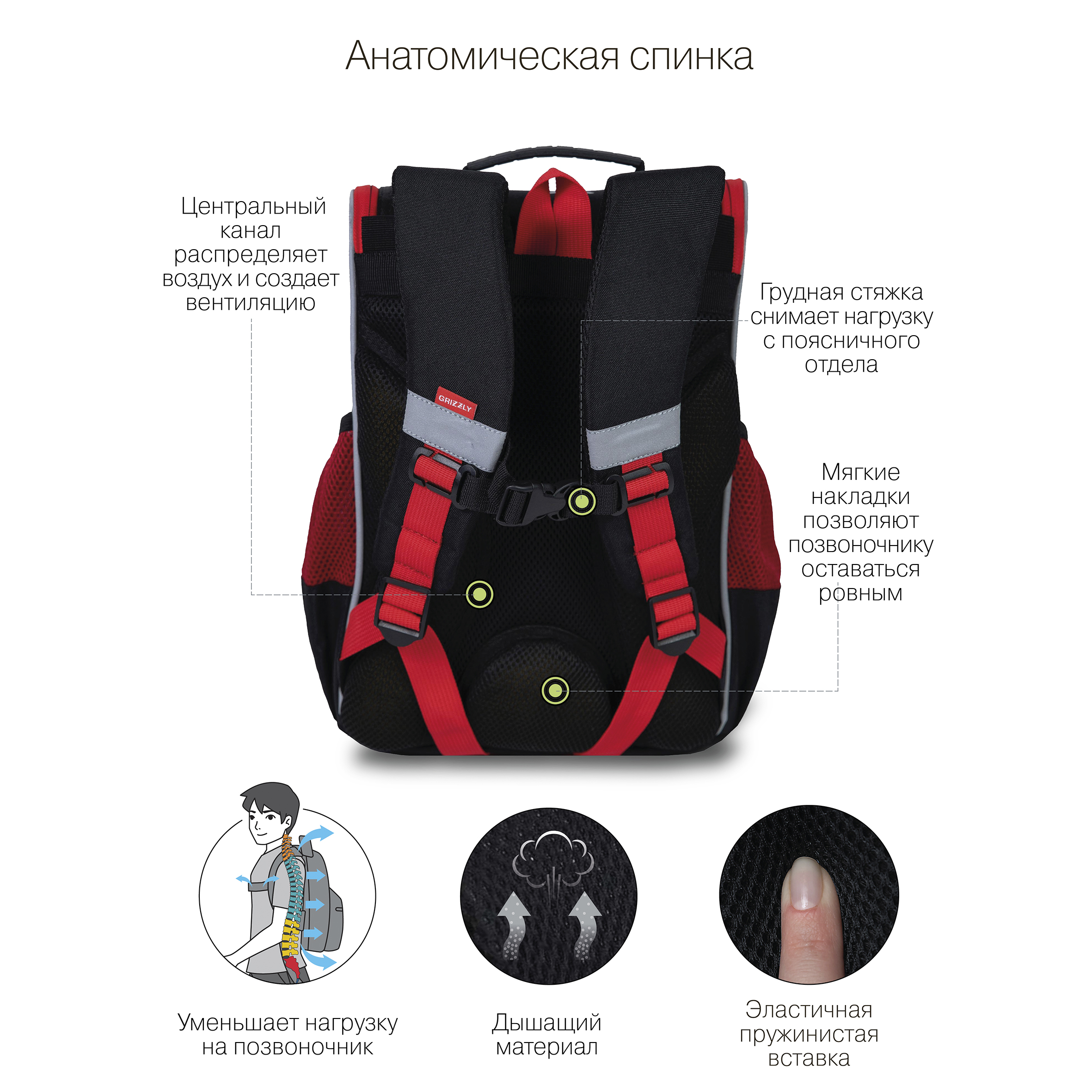 Жесткая конструкция, анатомическая спинка, вентилируемые лямки и грудная стяжка со свистком равномерно распределяют вес по спине ребенка. <br>