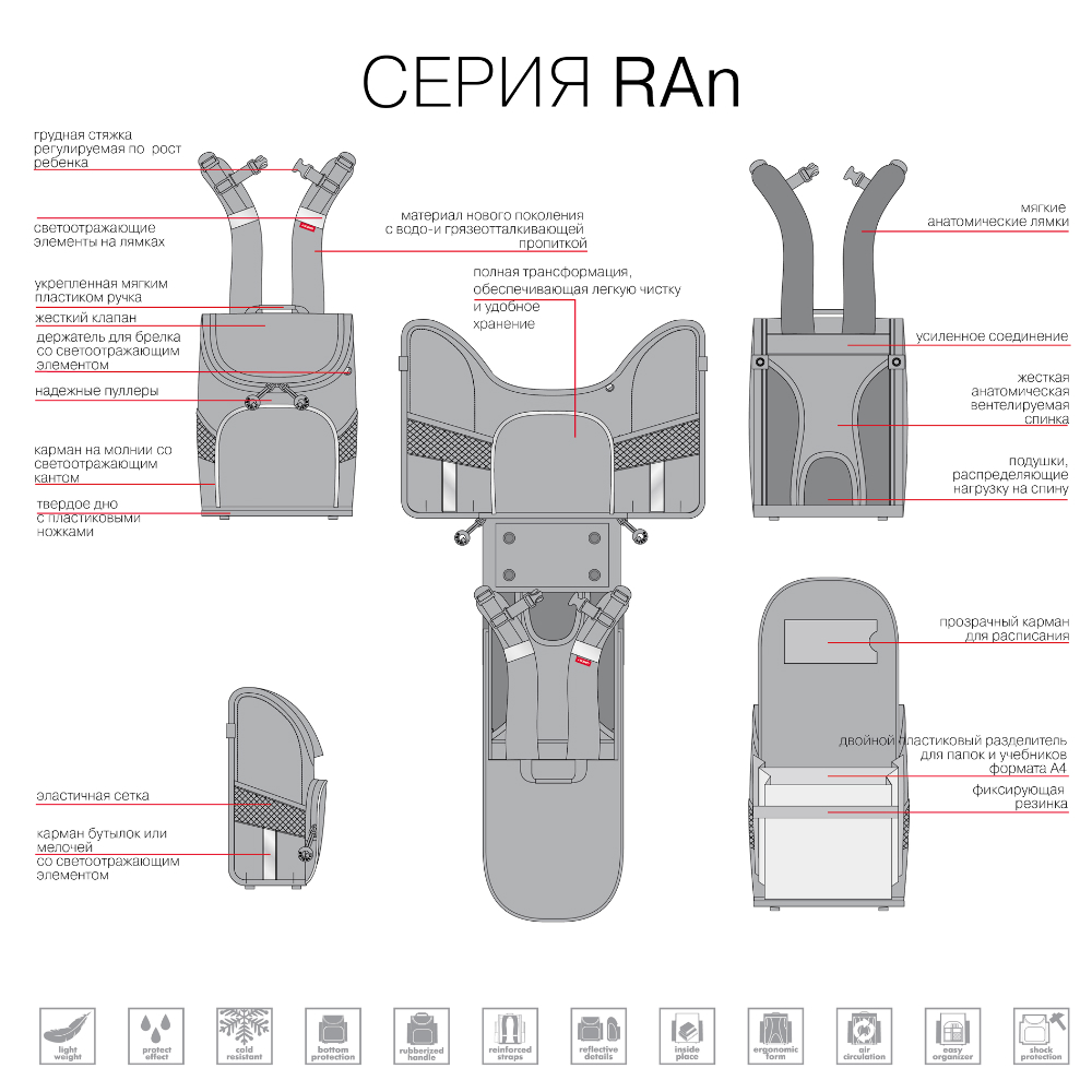Материал ранца с водо- и грязеотталкивающей пропиткой.