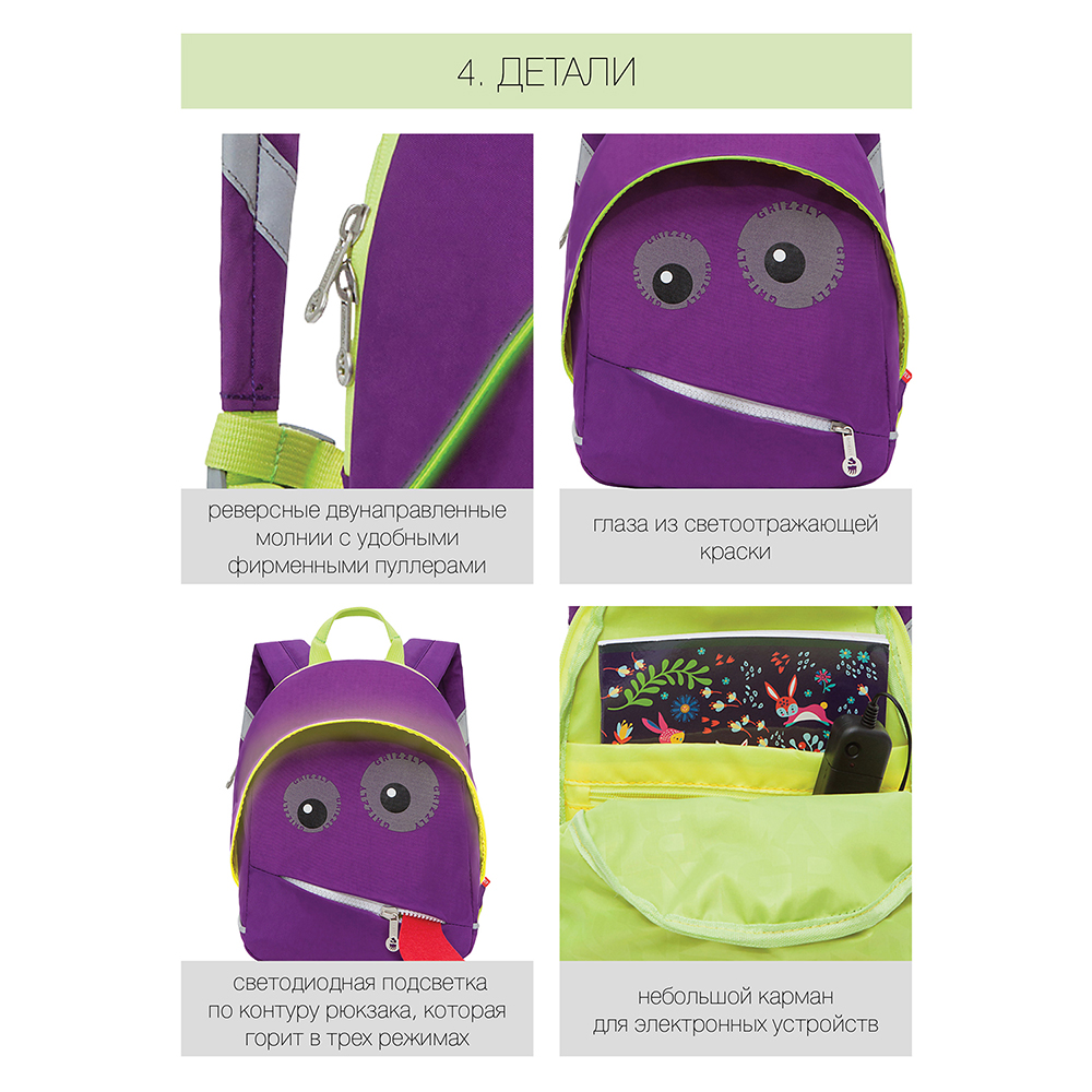Но мы не ищем компромиссов между внешним видом и качеством. В светящемся рюкзаке есть все то, что вы так цените в GRIZZLY. Ткань — плотный полиэстер с грязе- водоотталкивающей пропиткой, которая буквально не пачкается. Аккуратные и прочные швы гарантируют долговечность. Укрепленная спинка и нагрудная стяжка сохраняют осанку.