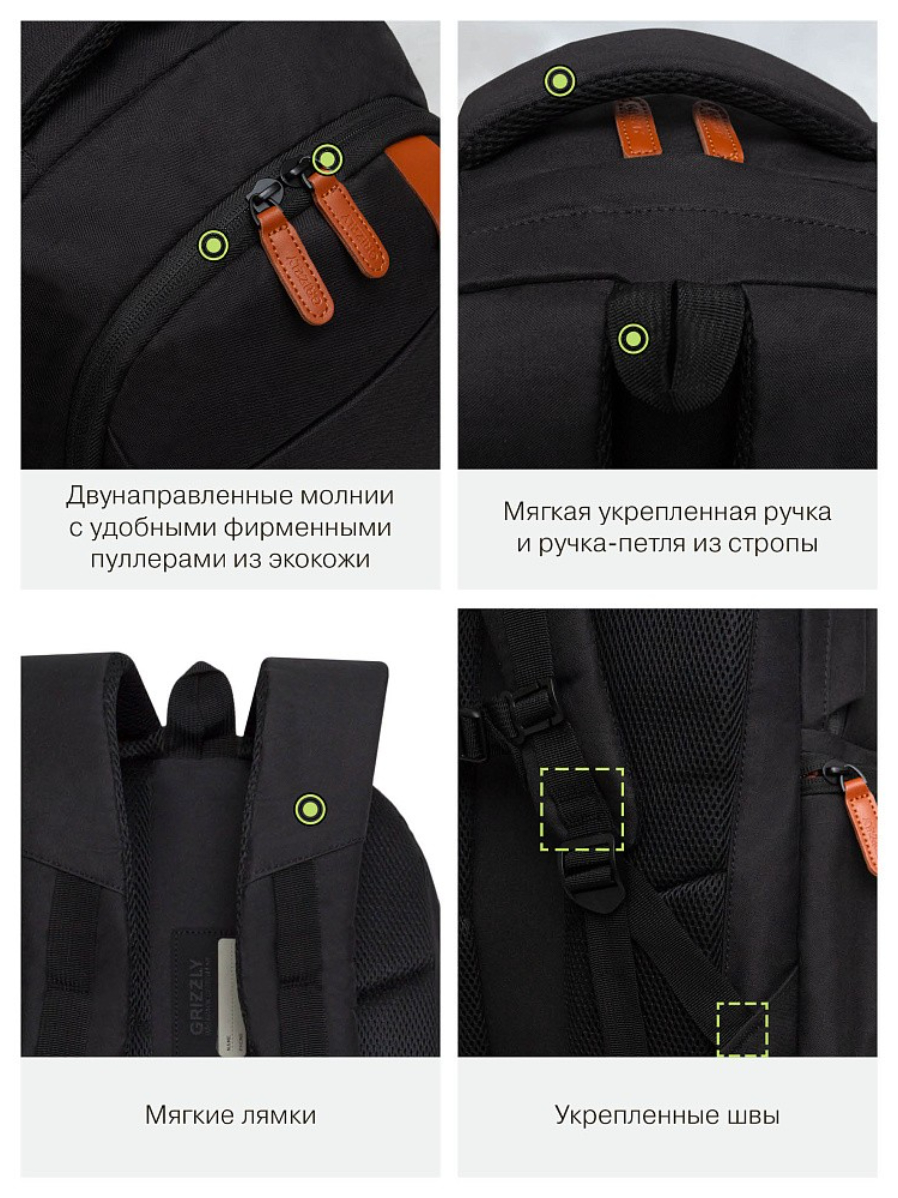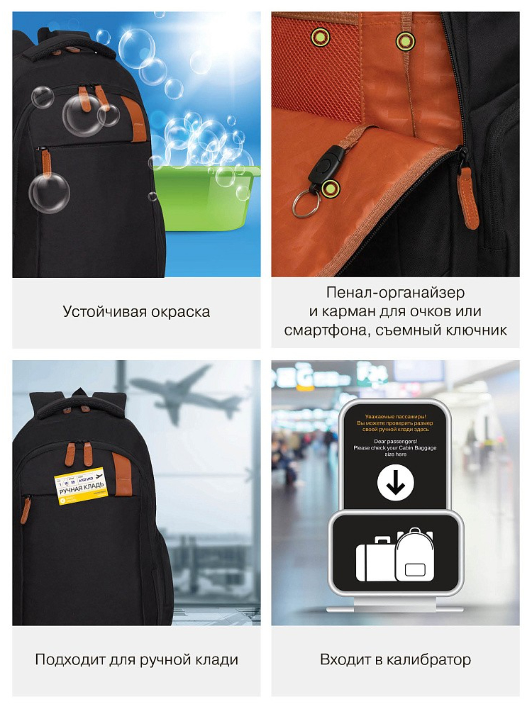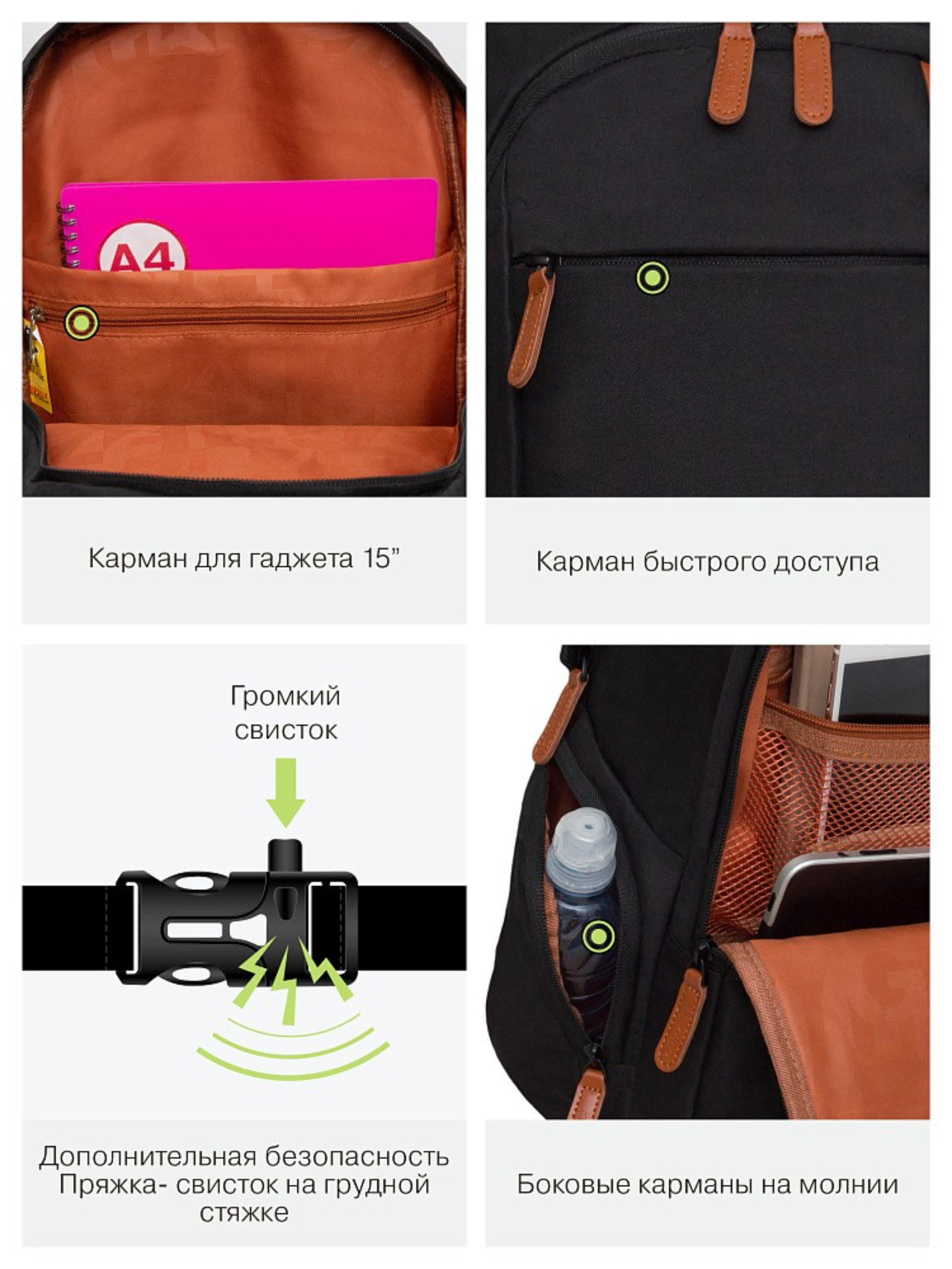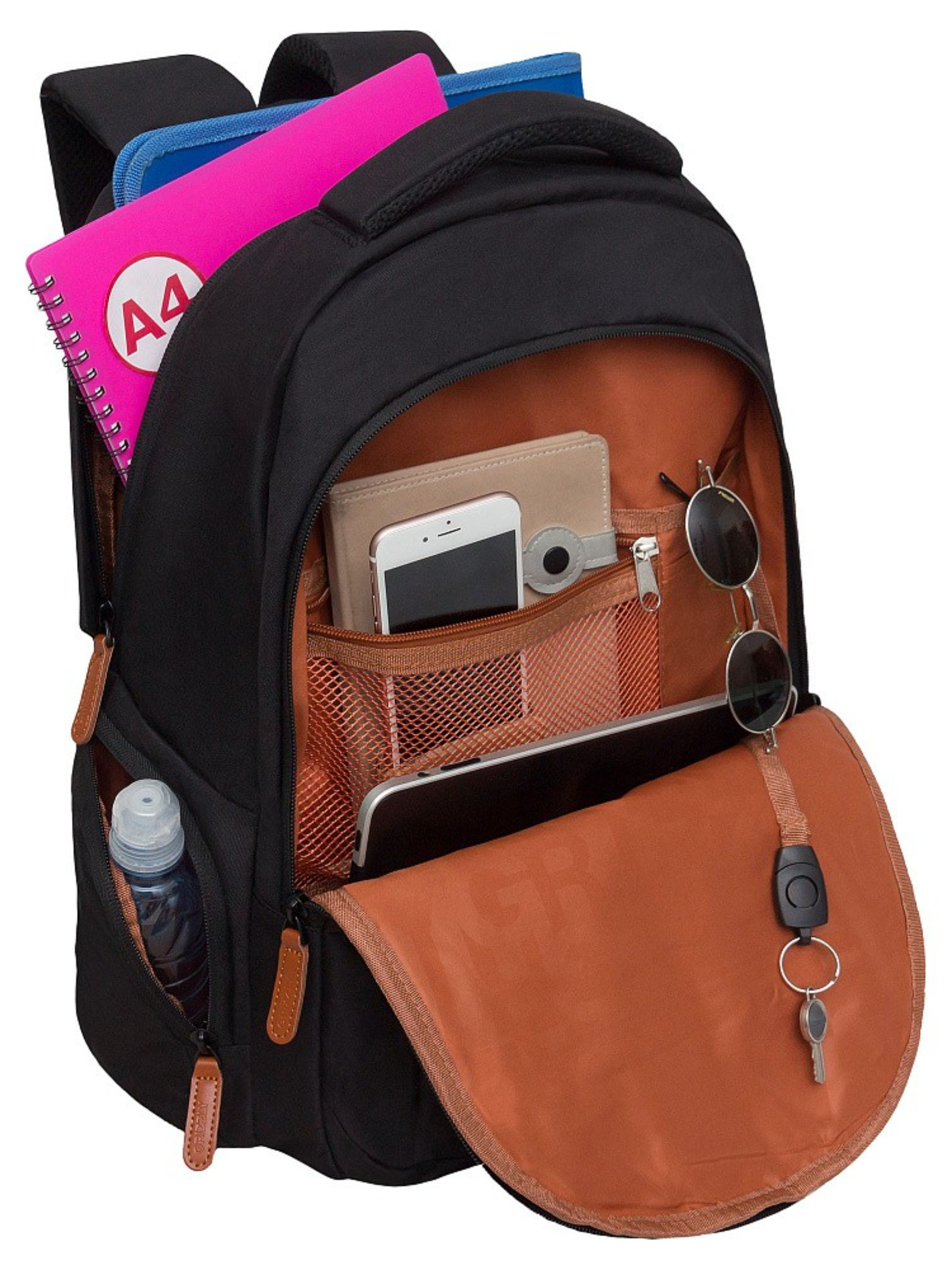 В рюкзаке два вместительных отделения, есть внутренний карман для электронных устройств.