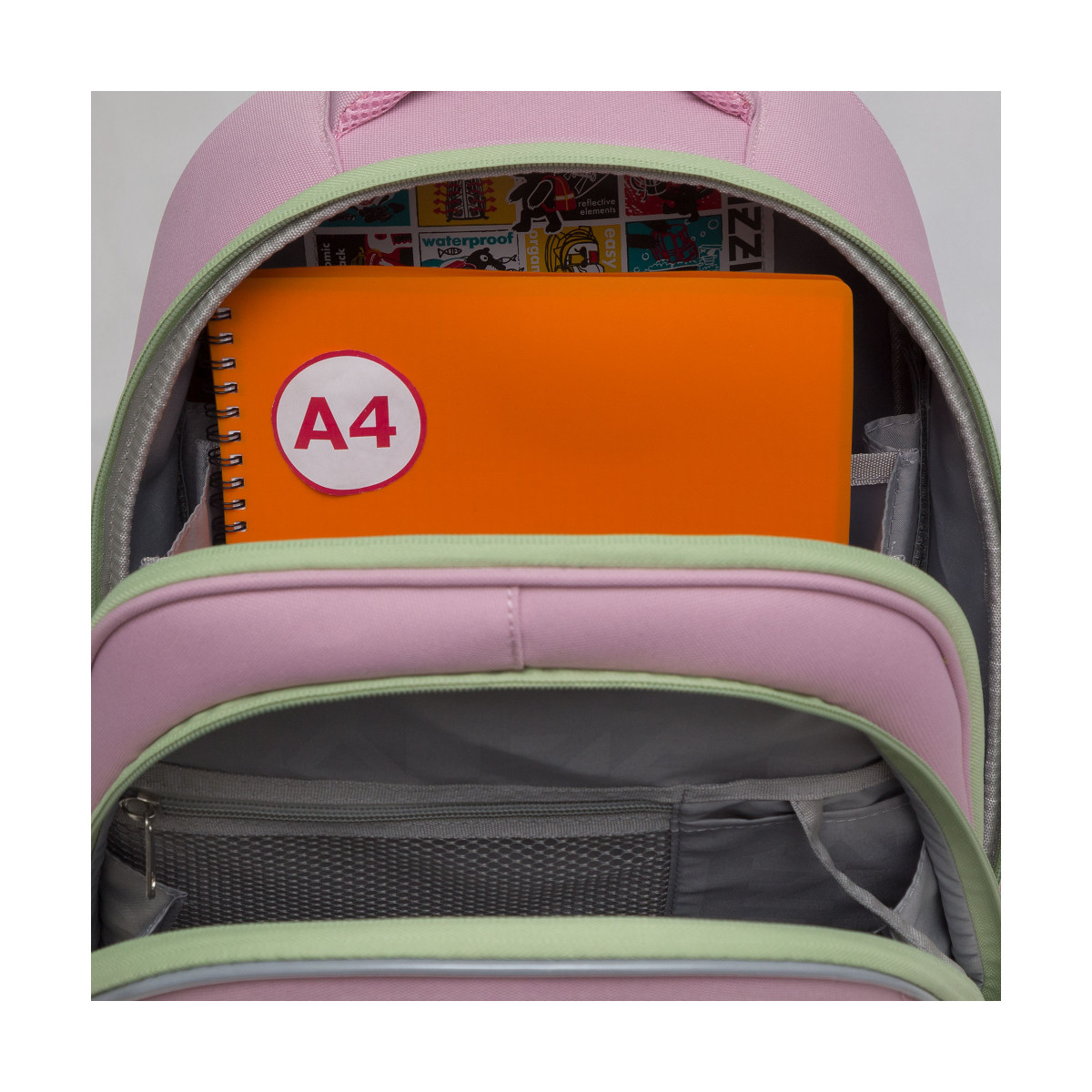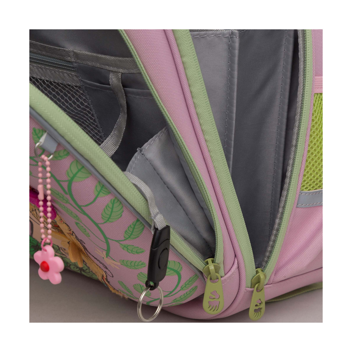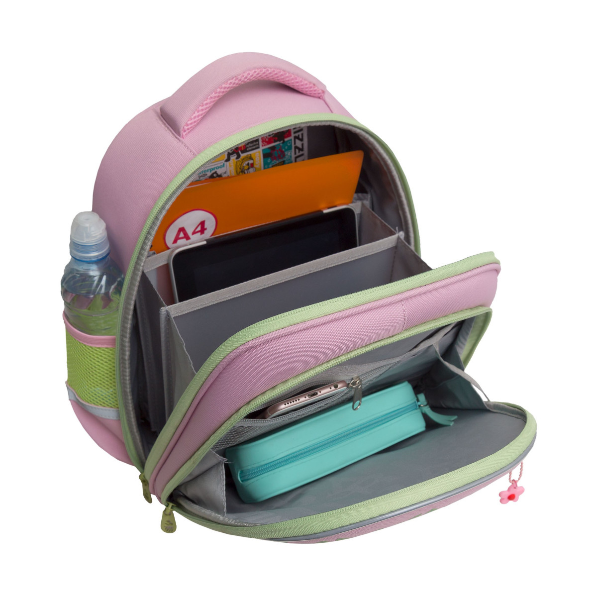У ранца два отделения, укрепленное дно на резиновых ножках, удобная ручка, дополнительная ручка-петля для и два вместительных боковых кармана для бутылочек с водой.