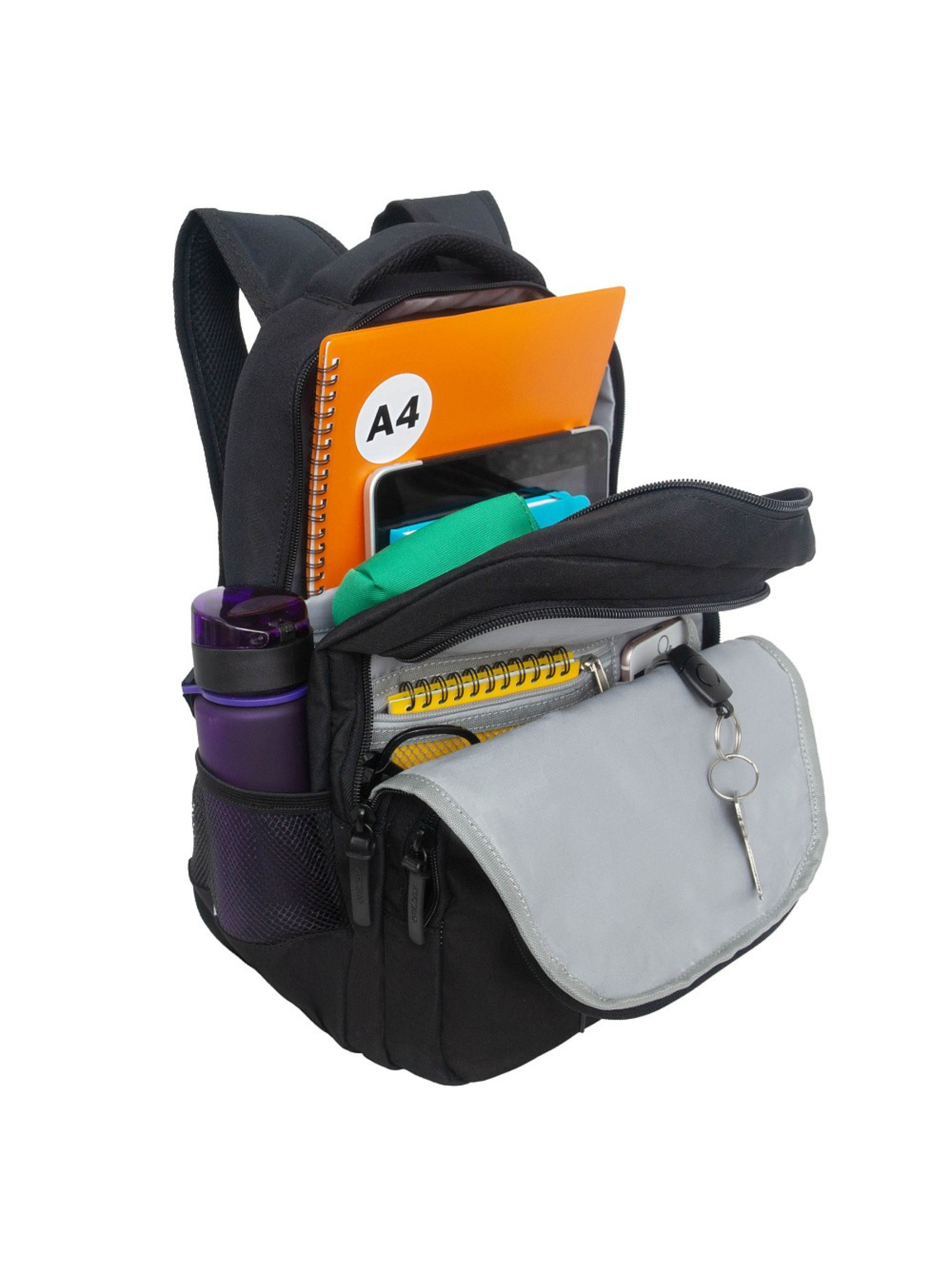 Есть два больших отделения: одно для книг, документов и пособий формата А4, другое для принадлежностей.