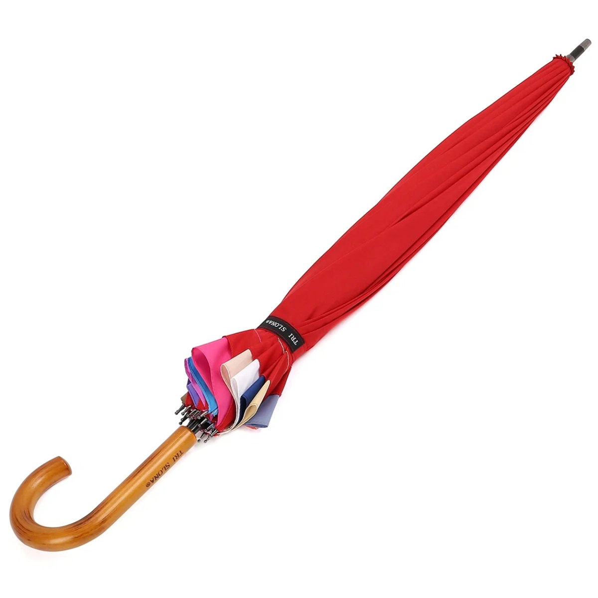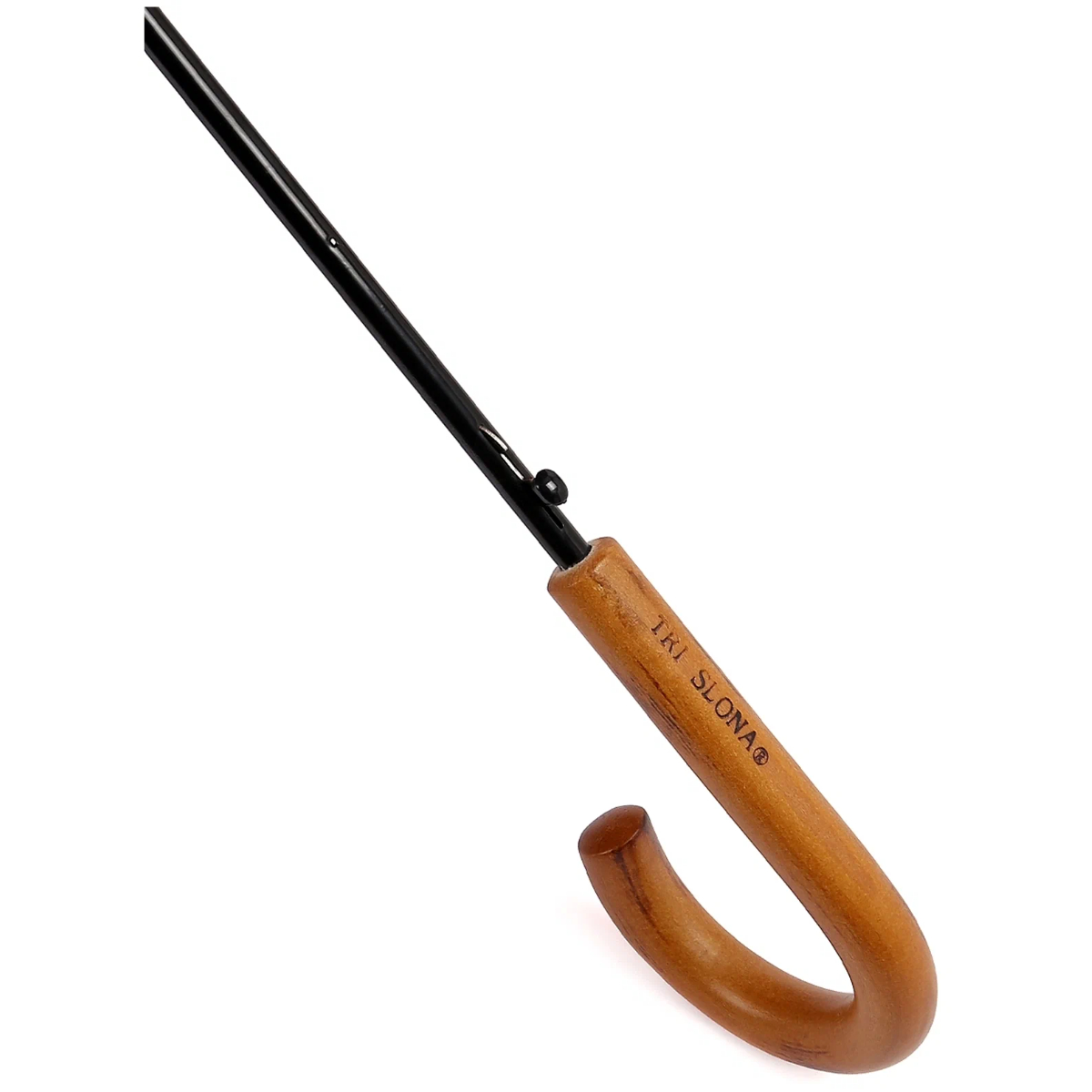 Зонтик Три Слона имеет удобную ручку крюк. Она выполнена из дерева.